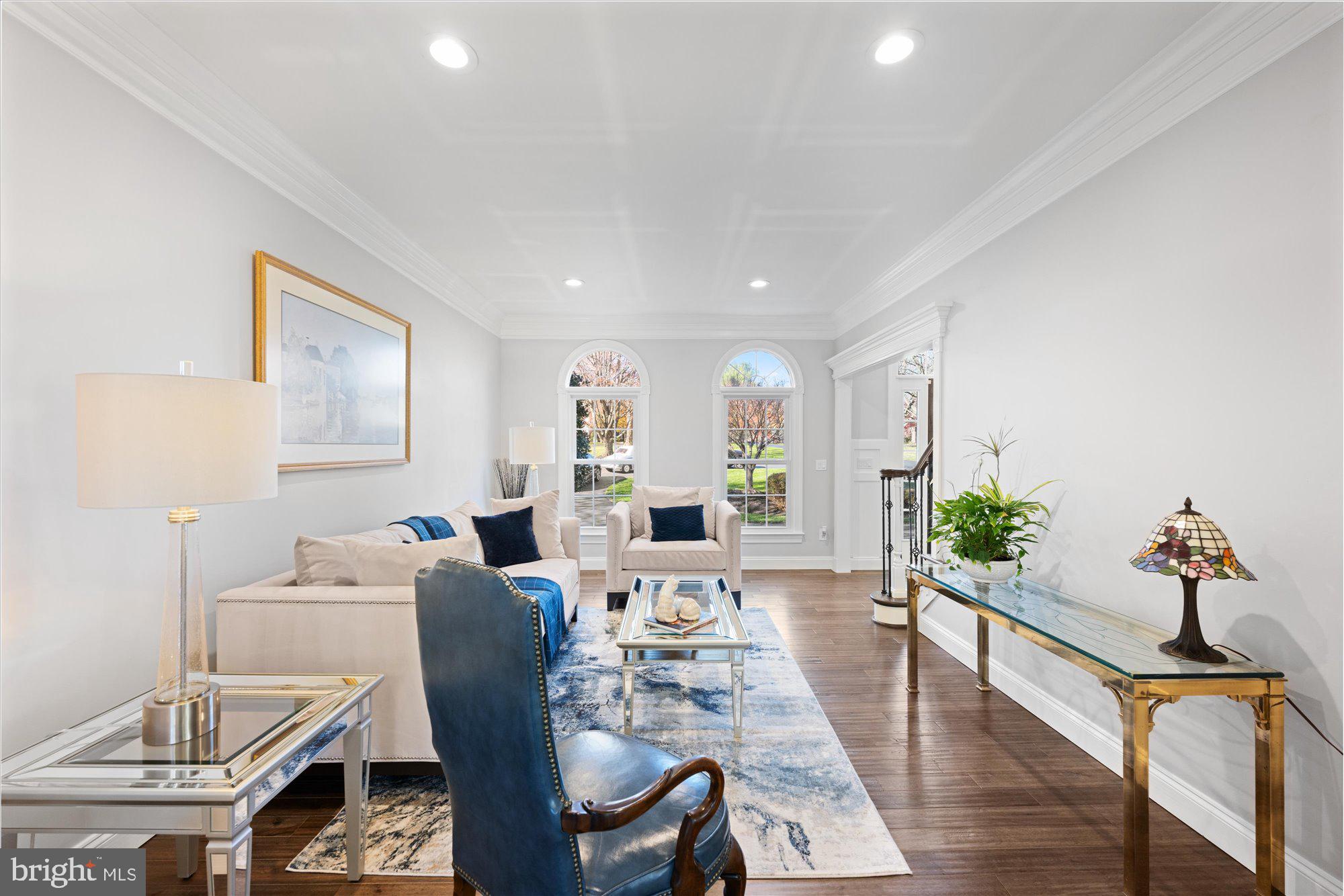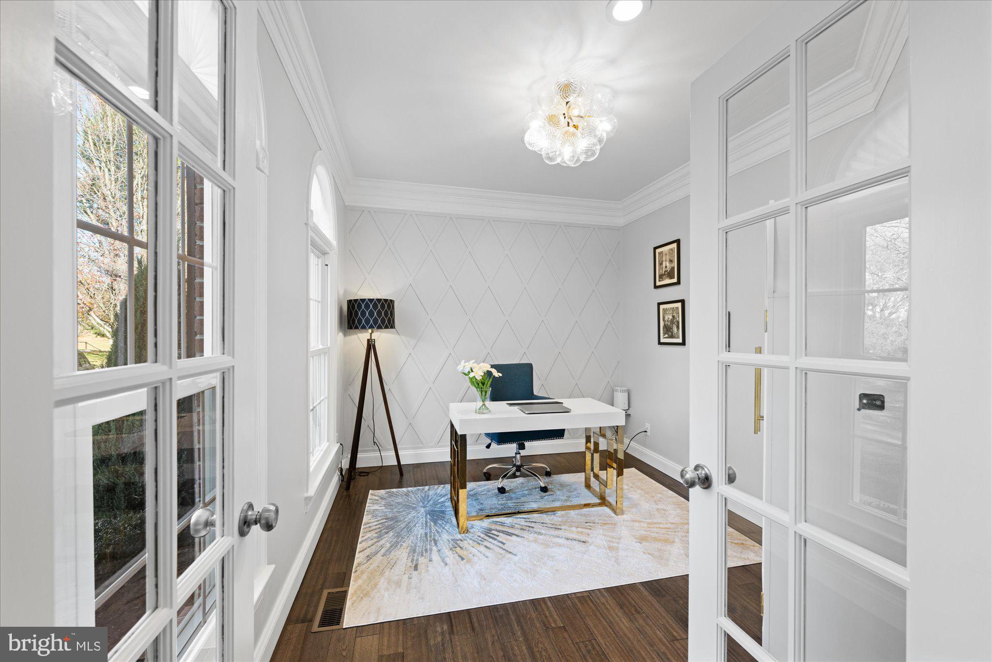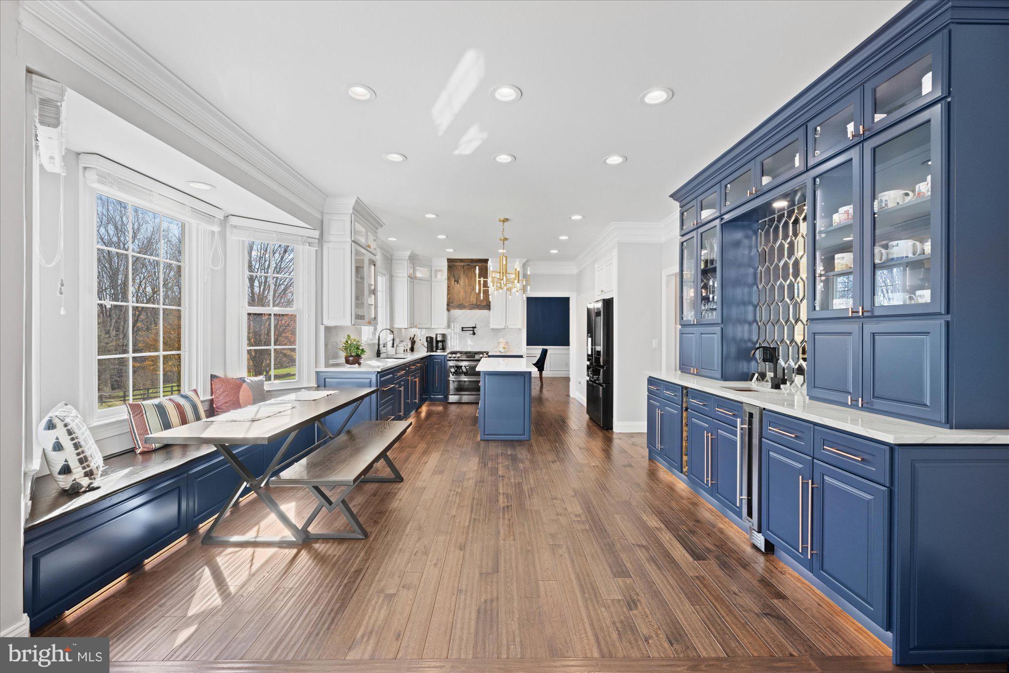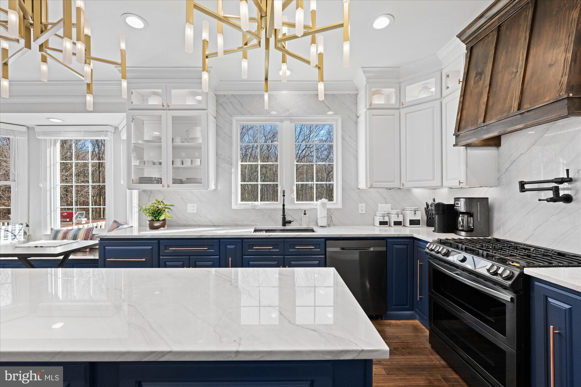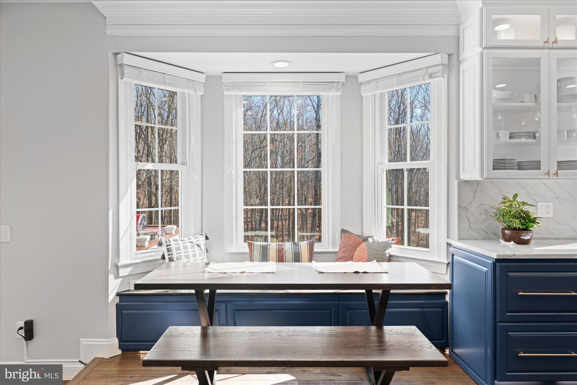 Hickory hardwood floors throughout; gracious entry foyer with custom millwork through to upper level; dramatic, magazine worthy Great Room with vaulted ceiling, enhanced by dramatic dark wood, beams, a wall of glass overlooking the magnificent grounds, wood burning fireplace with Carrera marble surround flanked by, custom solid red oak built-in, and French door with transom windows leading to the expansive deck providing a front row seat to a sylvan view; dreamy Kitchen, fully renovated in 2024, with all wood, soft close, dovetail construction cabinets to the ceiling topped with exquisitely detailed moldings; Quartzite countertops and backsplashes, "Smart" black stainless steel appliances including French door refrigerator with beverage drawer, double oven gas range with dark custom hood, Dishwasher, Microwave, pot filler, double chandeliers at island, custom copper hardware, custom accent light in glass door cabinets, upper cabinets and at toe kick, custom built banquet seating with storage, custom table and bench seat; custom Wet Bar with white wine (7 bottles) and red wine (12 bottles) storage integrated into cabinetry, accent lighting at glass door cabinets and toe kick, hammered copper sink with black hardware; holiday-dinner sized Dining Room with spectacular modern crystal chandelier and pastoral views; Office with whimsical bubble chandelier, custom millwork accent wall and recessed lighting; formal Living Room with Palladian windows, recessed lighting and extensive millwork ; discreetly placed, renovated in 2023 Powder Room with marble topped vanity, starburst chandelier and marble accent wall with gold accented, art deco tile to the ceiling; Mud Room (too pretty to call it one!) with custom-made cabinets with storage and hangers and extensive millwork adjacent to 2-car showroom level Garage with 2025 epoxy floor, mounted open, adjustable shelving, new Garage door opener with wall mount and raised door tracks to accommodate a car lift.