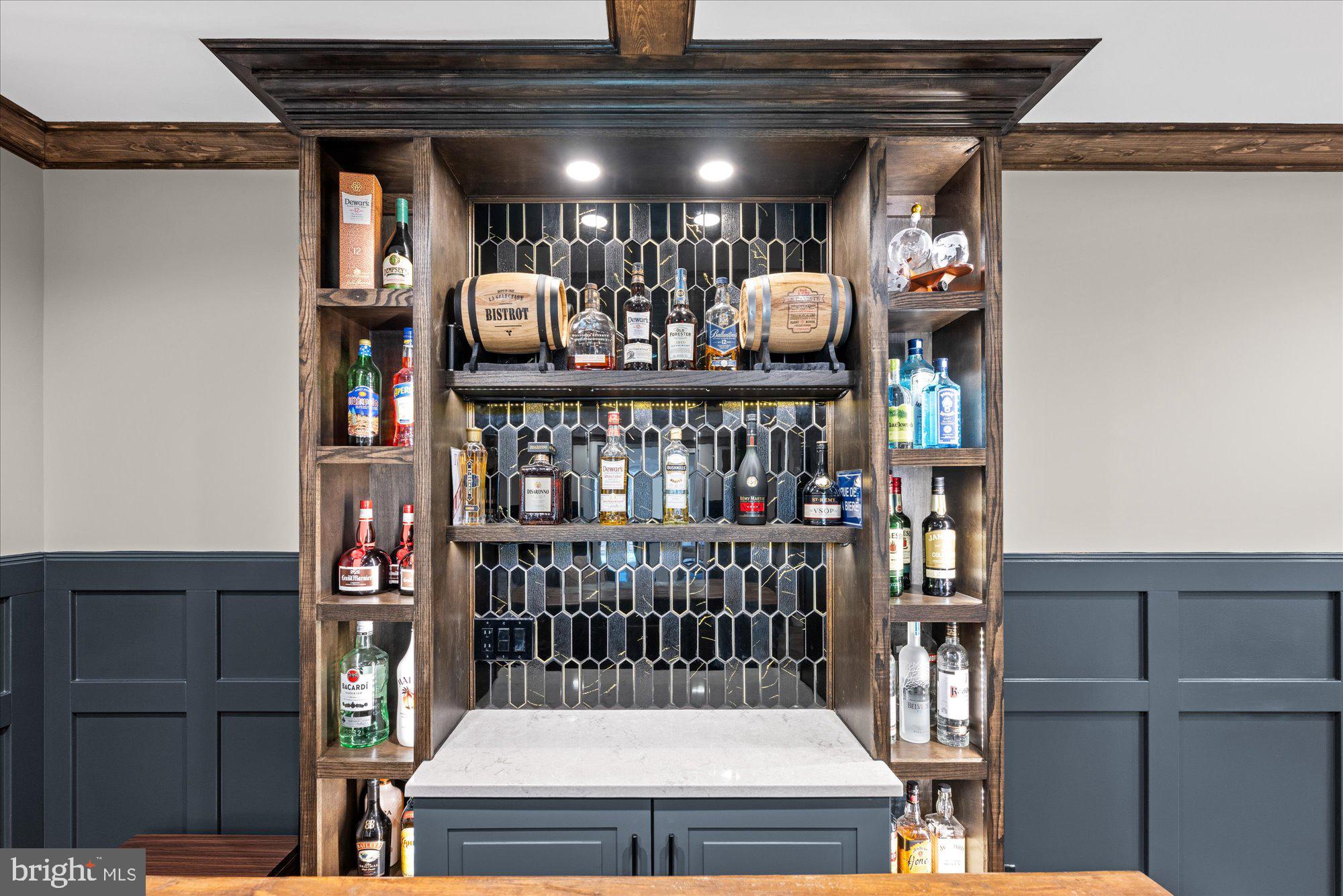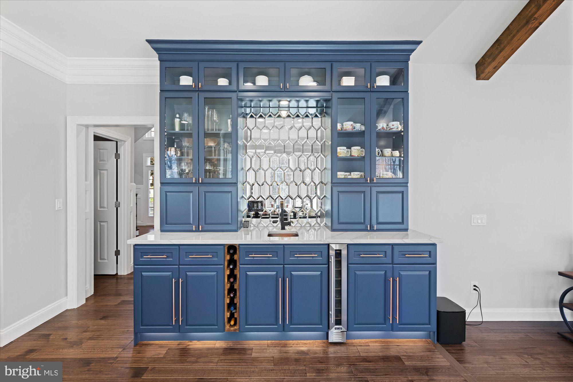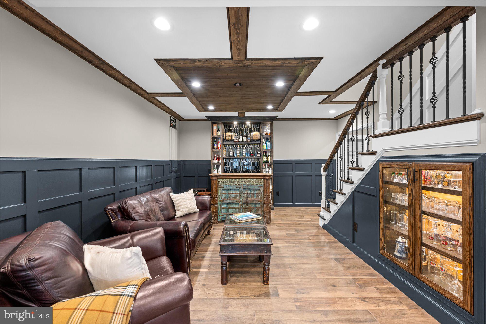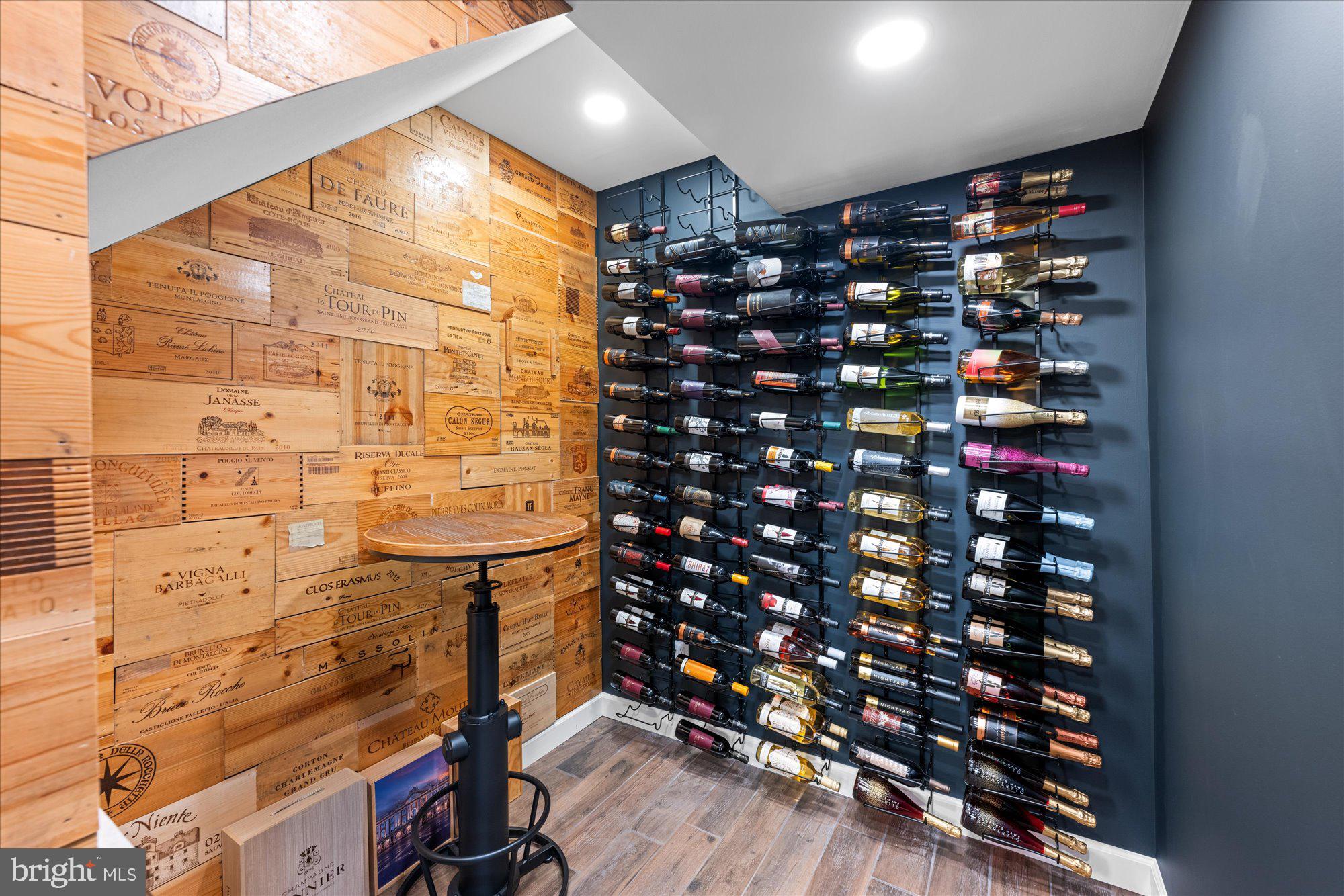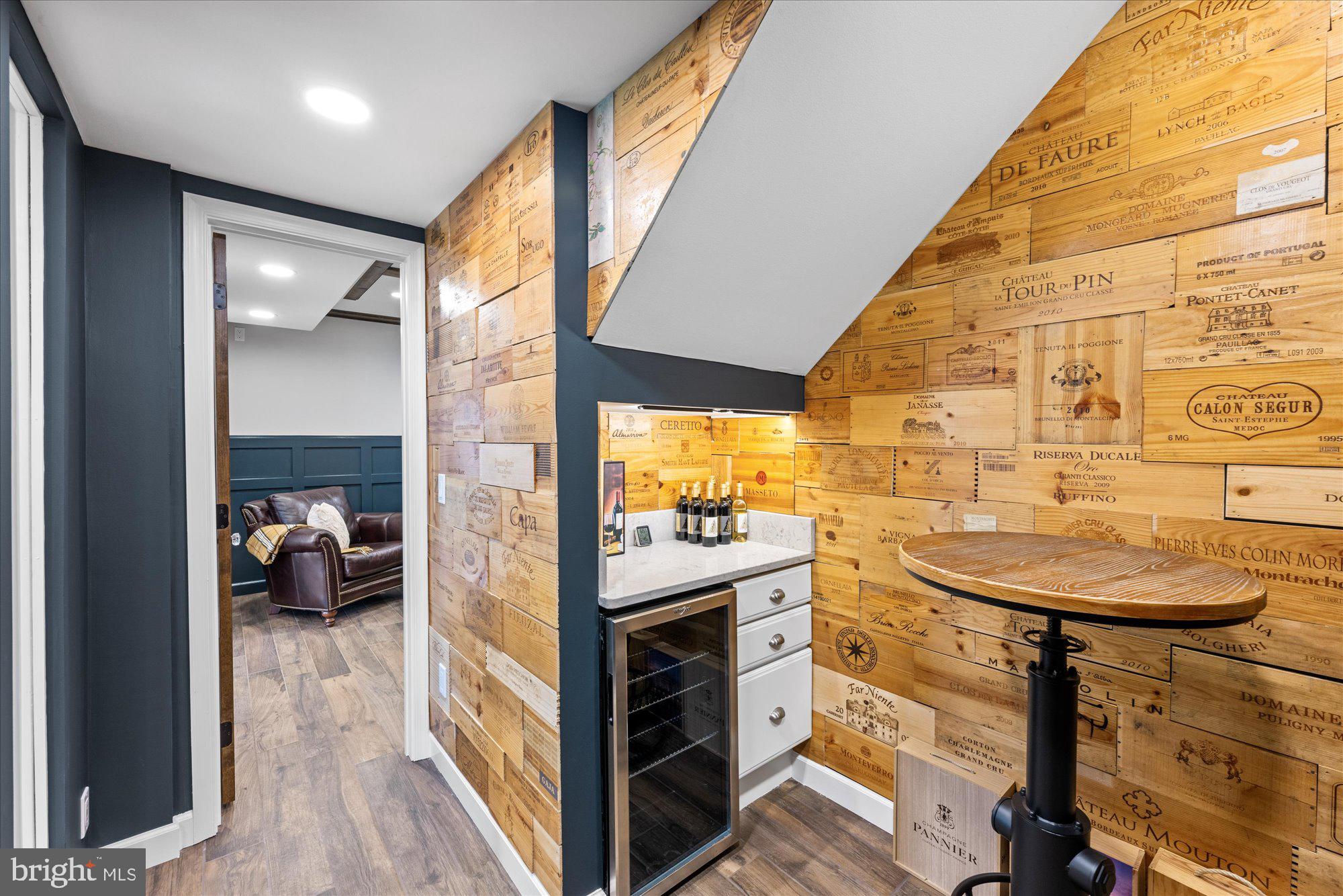 Wood-look ceramic plank tile throughout; Lounge with custom-built in dry bar with quartz top, glass tile backsplash, lighting shelving and toe kick, custom millwork at walls and ceiling, custom glass display cabinet with accent lighting; Wine Cellar with stained wood glass door; accent window into In-Law Suite Living Room, dimmable recessed lighting, custom wooden wine box walls, wine fridge, dry bar drawer cabinet, quartz countertop, cust