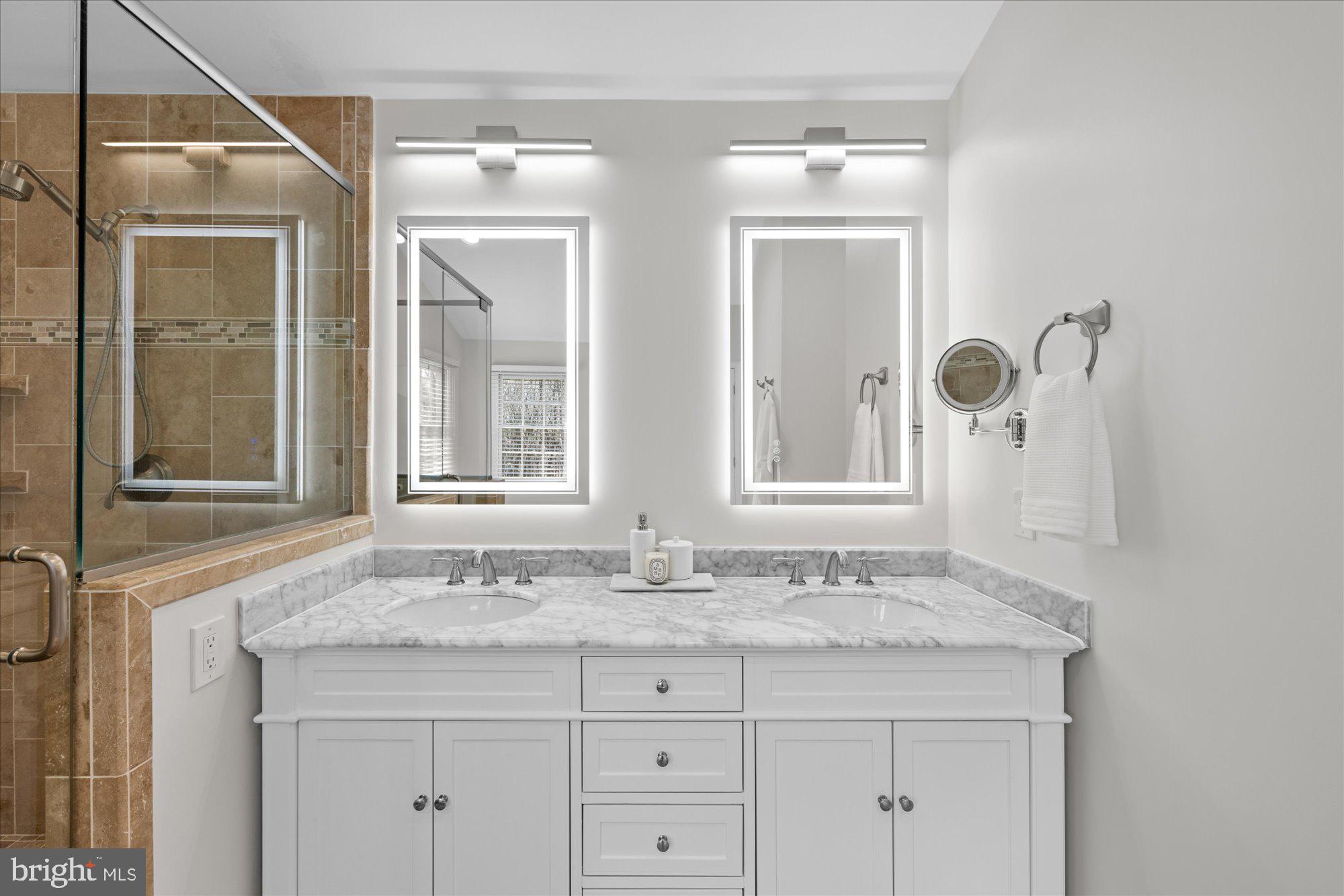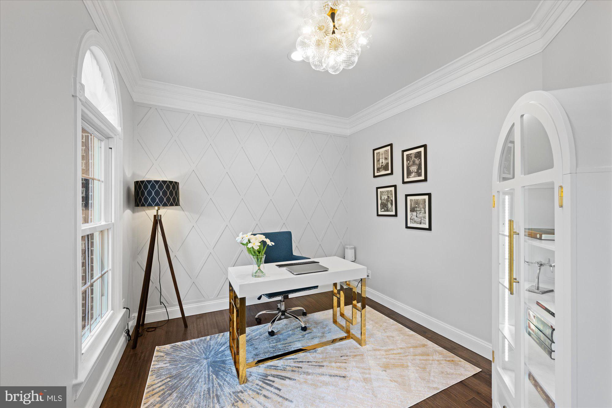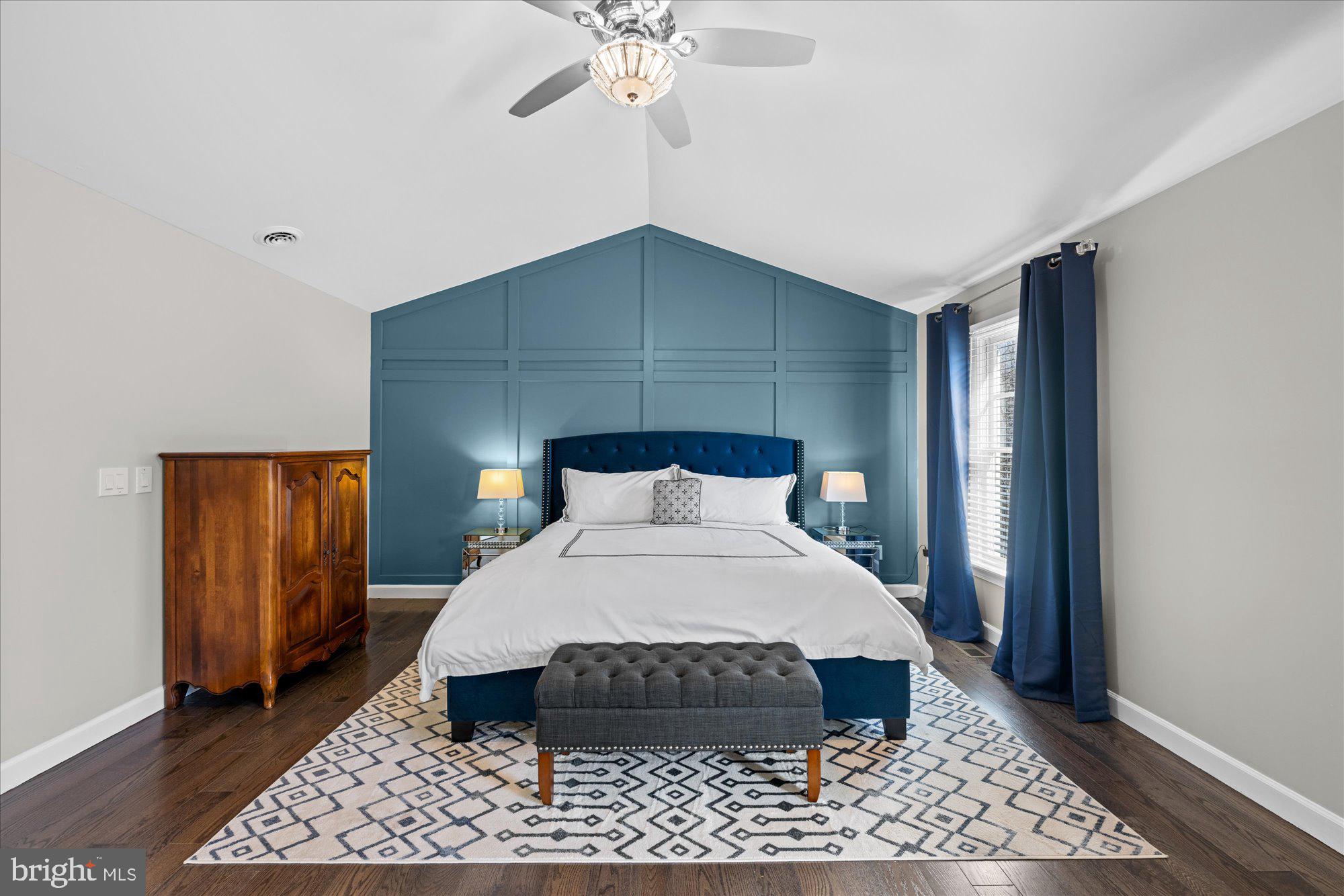 All new hardwoods 2021; beautiful and sprawling Primary Suite with custom millwork accent wall, dramatic electric fireplace with marble surround and custom mantle, stylish ceiling fan, enlarged walk-in closet with custom system, primary bath with recessed lights, new marble vanity, hardware and lighting, linen closet separate lighted vanity mirror with magnifying/makeup mirror, separate tub and shower. Tucked away Bedroom #2 with 11' cathedral ceiling, ceiling fan, charming dormer window, walk-in closet plus another closet; Bedroom #3 with double windows and large closet; Bedroom #4 with double windows and large closet; Full bath #2 (2022 renovation) with vaulted ceiling, Carrera marble flooring, vertical subway tile tub surround and vanity top, and charming chandelier. Laundry Room renovated in 2021 with custom cabinets, clothes rod, 2'6" deep shelving, and additional storage