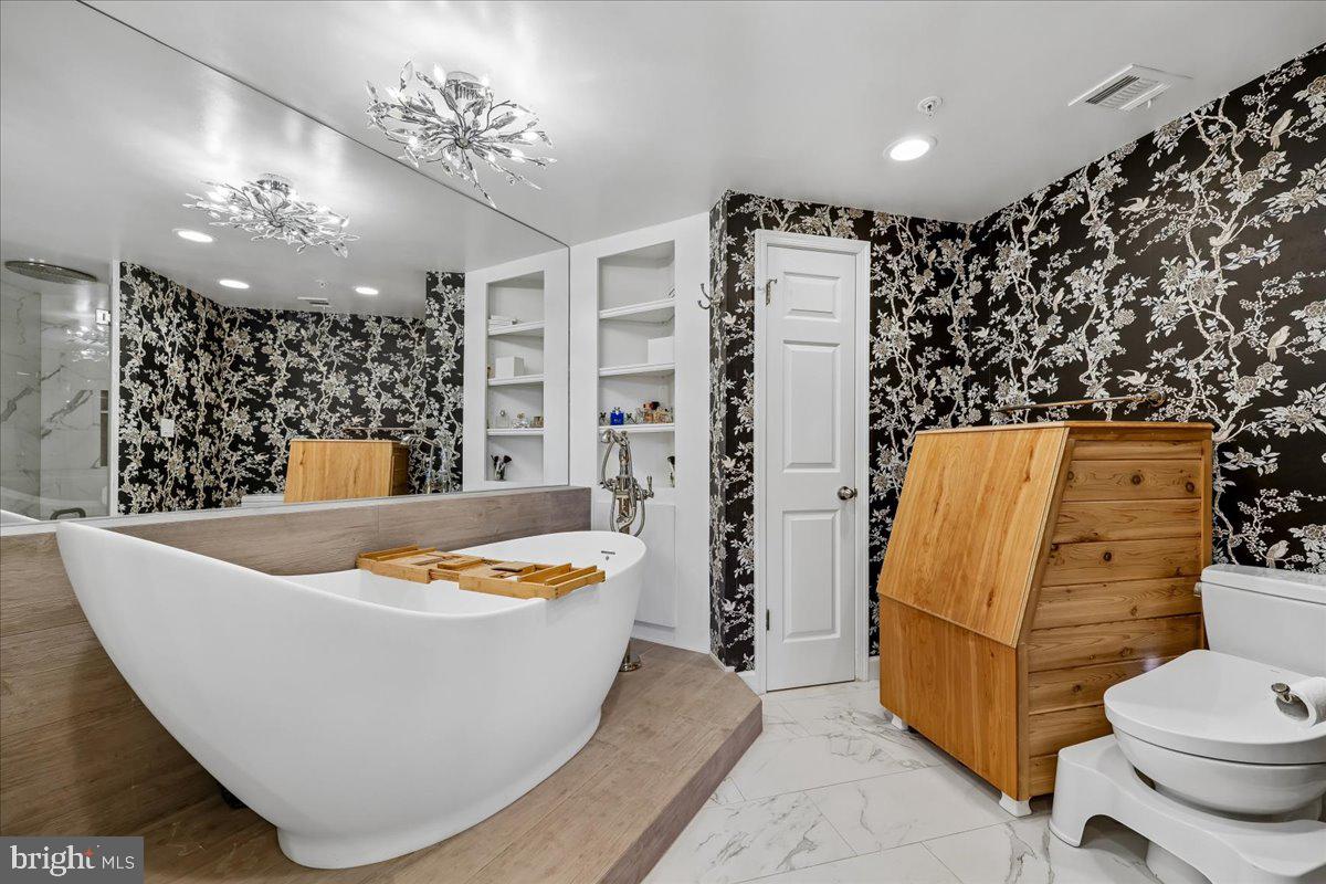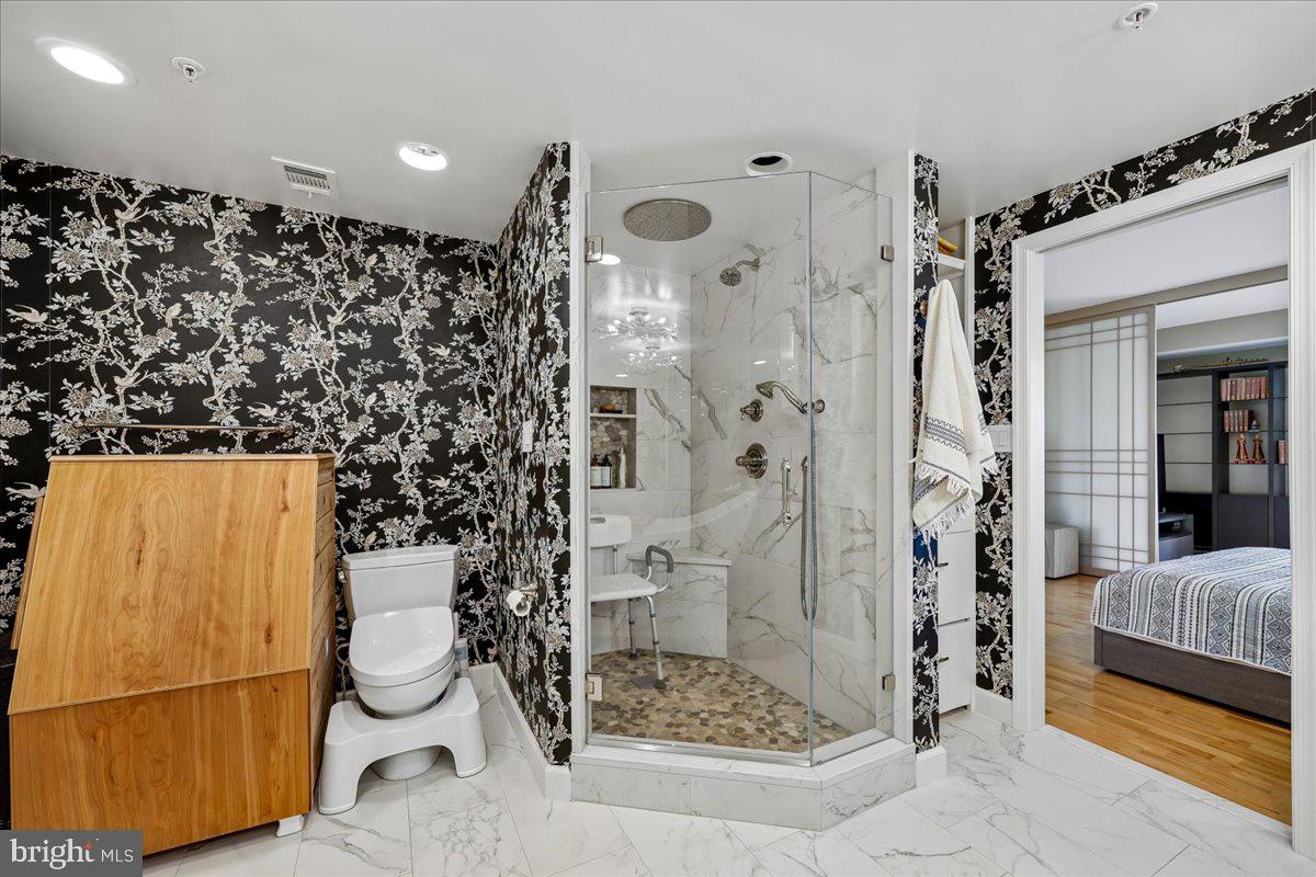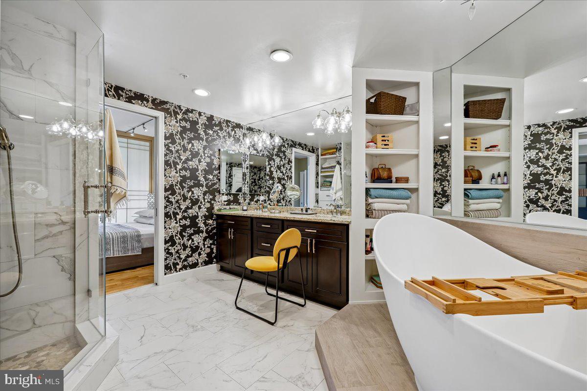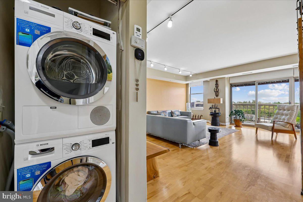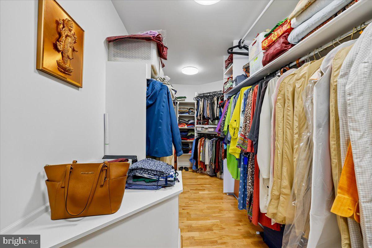 Welcome to 5000 Battery Lane - #1003...a luxurious penthouse apartment located in Madison Park - a budding building in downtown Bethesda. This truly exceptional condo with 1780 Square feet of living space features 180-degree view of Bethesda from your private balcony. Enjoy the open floor plan that includes a welcoming foyer, spacious living room and dining room that offers a wall of windows that creates stunning views of skies. The modern eat-in kitchen is a chef's delight with stainless steel appliances (Wolf induction stovetop/range, GE Cafe refrigerator 2.5 years old, Bosch dishwasher, KitchenAid microwave, granite counter tops, copper backsplash and a bay window bump out to sit and enjoy your morning coffee. The primary suite boasts just the right amount of natural light and a large walk-in closet with a built-in safe, Japanese rice paper door to the sitting room with Juliet balcony. The spa sized primary bath will take your breath away with stone soaking tub, spa rainforest shower and double vanity. Two additional generous size bedrooms share a wonderful full hall bath and feature Juliet balconies. Attention to detail at every turn...hardwood floors, Hunter Douglas automatic blinds, custom lighting and sliding barn door to the kitchen. In addition, the unit has a Bosch washer & dryer, (2.5 years old), two assigned parking spaces, 2 storage rooms (one storage room a few doors down from the unit and a second storage room in the garage). Madison Park condominiums offer just the right balance of amenities and location...secured lobby, fitness center, party room, on-site management, large outdoor spaces and a lovely park a few doors away with tennis and basketball. You'll love watching the 4th of July fireworks in addition to enjoying beautiful sunsets, the sunrise, and changing of the seasons. The convenience of Bethesda is blocks away offering restaurants, shopping, Bethesda Trolley Trail and Bethesda Metro.
