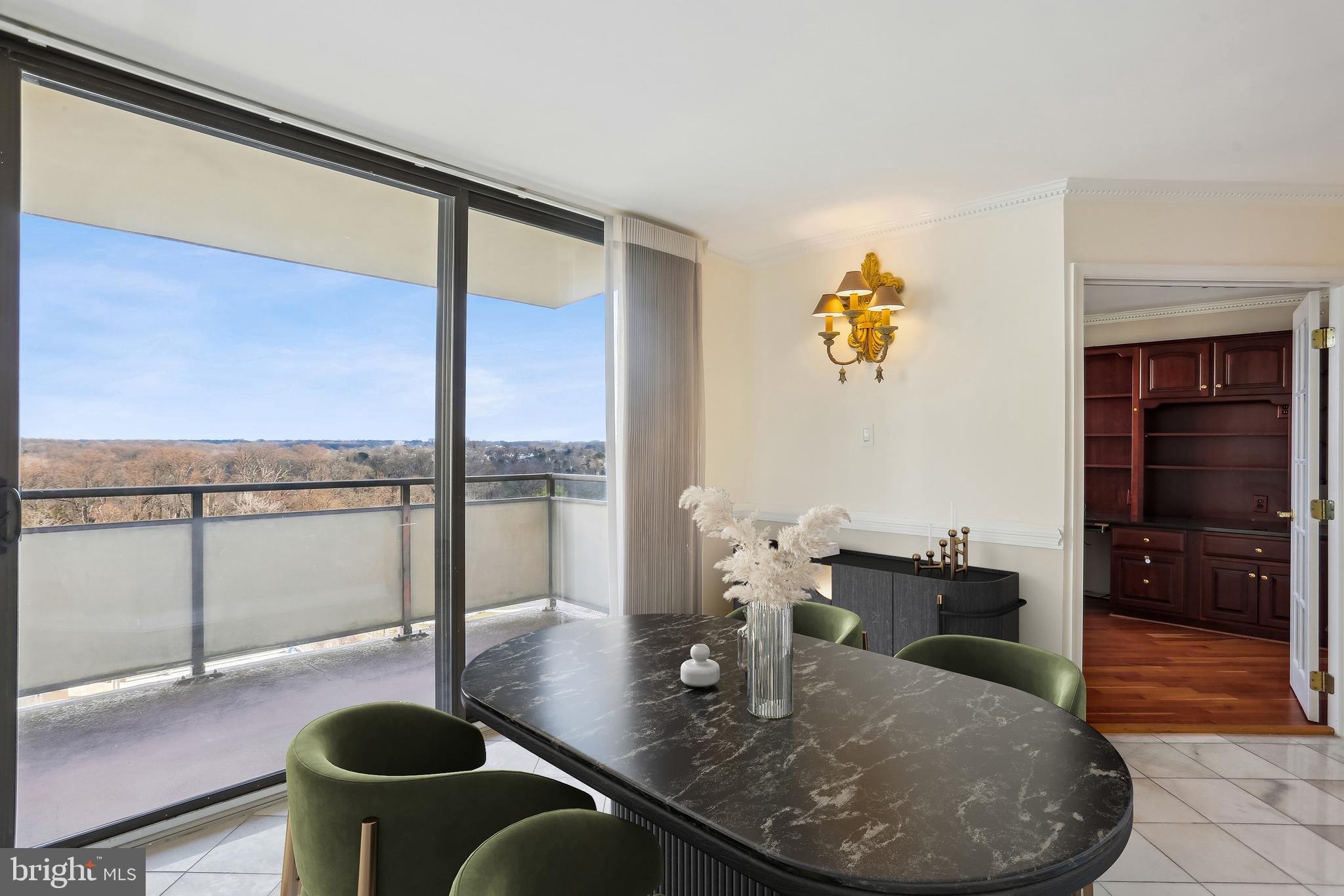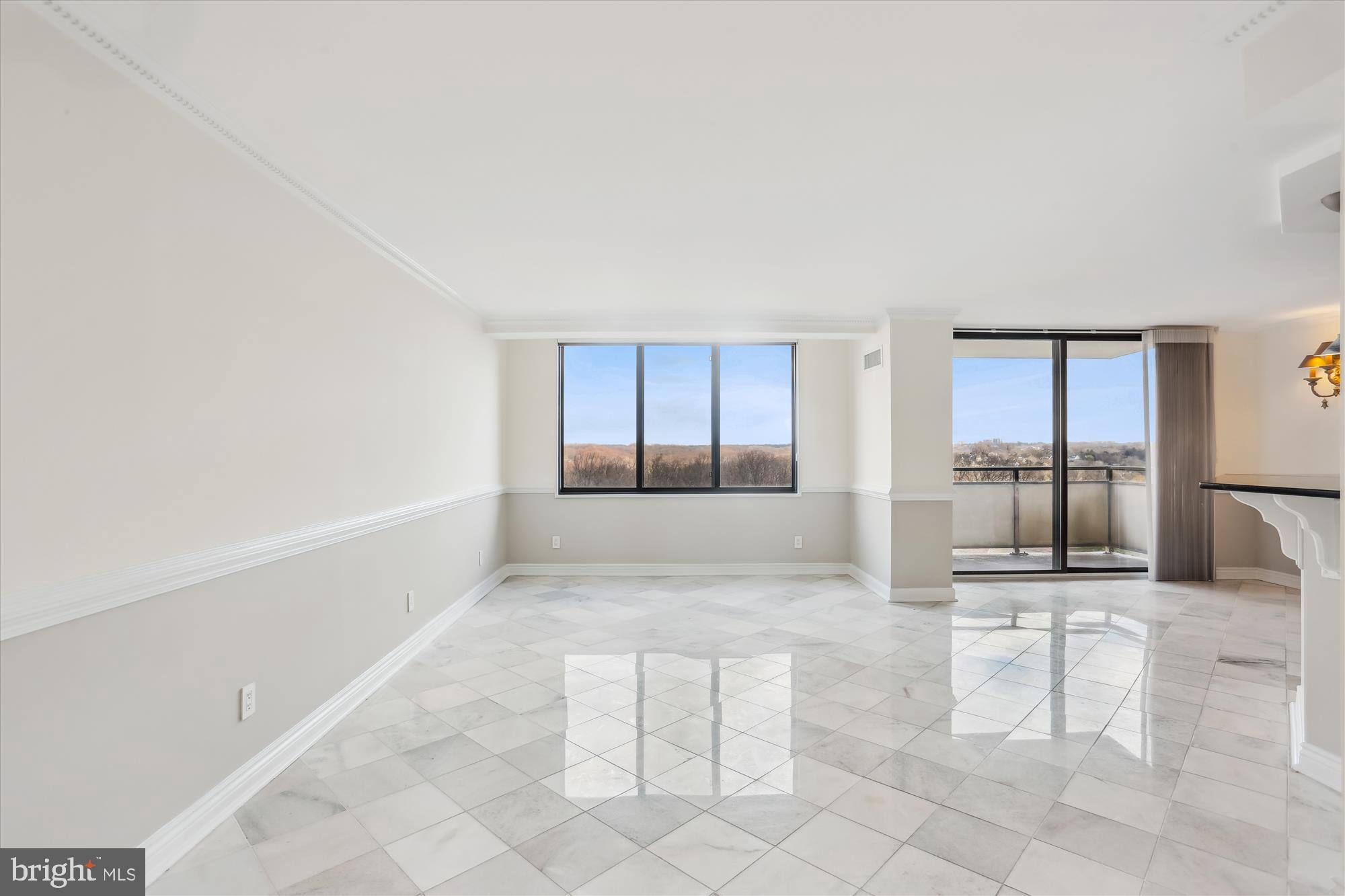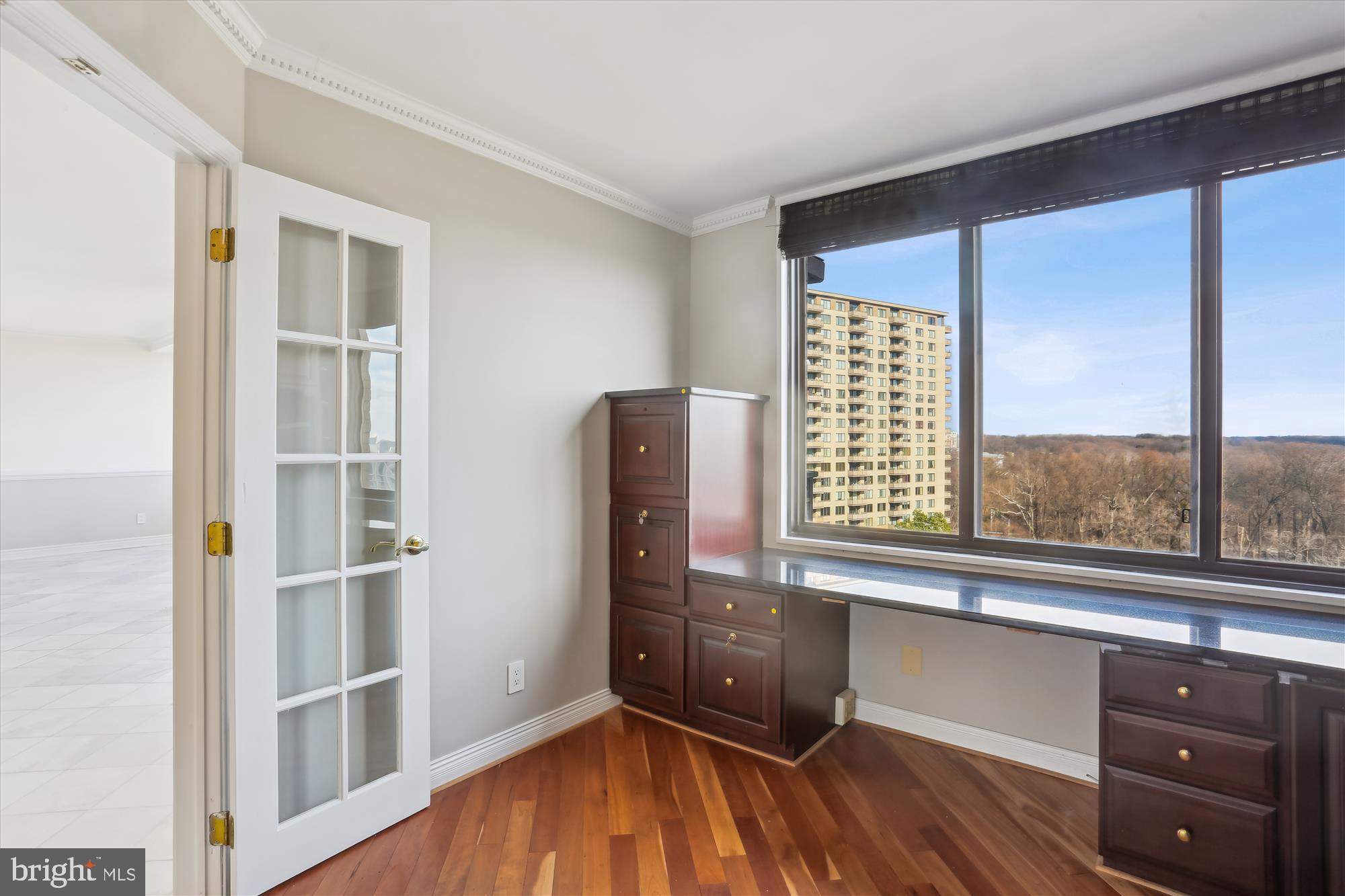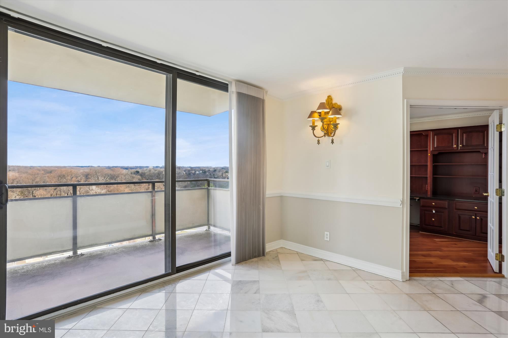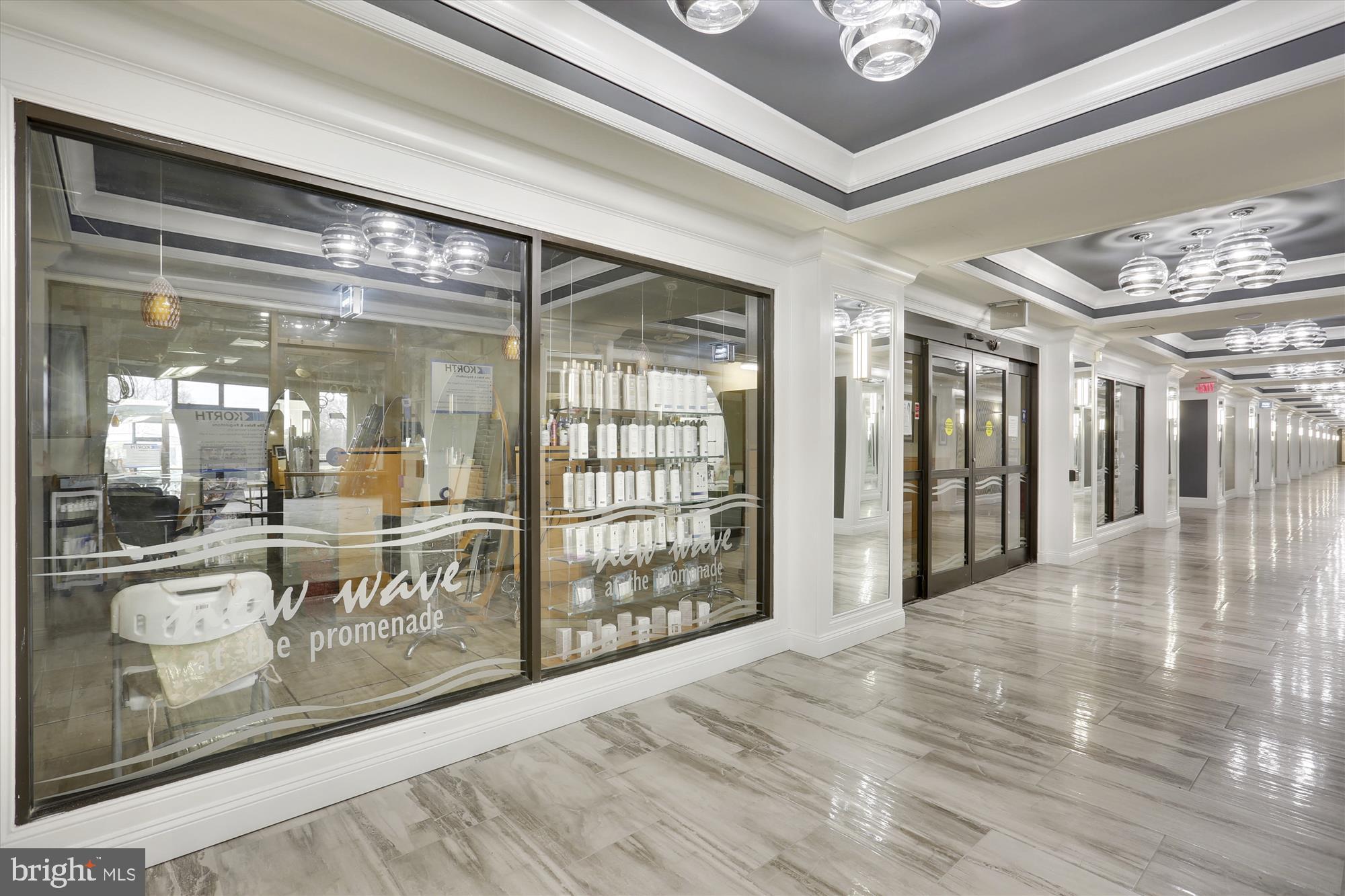 Welcome to The Promenade! Its sought-after location offers year-round resort style living in the heart of Bethesda. As you enter the foyer of this luxurious two bedroom, two bath apartment you will surely be impressed with its open concept living space. The entrance boasts two convenient guest closets with ceramic tile flooring that stretches throughout the main living areas. The sun -filled living room is richly designed with crown molding and is the perfect spot to entertain family and friends. The focal point of the home is the gourmet kitchen, featuring an abundance of custom cherry 42" cabinets that include a built-in pantry, ceramic tile backsplash, granite counter tops, stainless steel appliances (gas cooking) and large breakfast bar with seating for six. Enjoy your first cup of coffee in the dining room adjacent to the kitchen. Its sliding glass door opens to a generous size balcony with a picturesque view of the pool. One of the highlights of this unit is the handsome design of its home office/bonus room with lighted French doors, hardwood floors and built-in cabinets and desk. All anyone would ever need to work from home. The sweeping primary bedroom suite is extraordinary....brand new upgraded carpet, crown molding, recessed lights, spacious sitting room and sleeping room with ceiling fan with light and sliding glass door with second balcony. The closets in this suite are unbelievable with mirrored door closet, huge walk-in closet with custom built-ins and an additional walk-in closet in the primary bath. The luxury ceramic tile bath boasts a cherry vanity with double bowl sink with granite top and tub/shower. The second bedroom on the opposite side of the apartment is equally well appointed. Lighted French door welcomes you to this spacious bedroom with ceramic tile flooring, wall sconces, spacious walk-in closet, large window that floods the room with natural light and a second private bath. The bath features a long cherry vanity with a single sink with granite top and glass enclosed tub/shower. With its neutral decor and fresh paint this nearly 2000 sq. ft. apartment is ready for the buyer that demands perfection. Plenty of natural light and modern finishes complement the overall look and feel in this elegant unit. In addition, there are two of the best garage spaces in the building near the South elevator. The monthly fee includes property taxes, all utilities, basic cable, and access to amenities. The resort-style Promenade complex offers a vast array of amenities...indoor and outdoor pools, tennis and pickleball courts, state of the art fitness center, community garden, library, etc. The retail arcade includes Chef Tony's restaurant, grocery store/deli, dry cleaners, travel agent, and beauty salon. Don't miss your opportunity to experience luxury living, beautiful views, and unmatched amenities. The Promenade has it all!