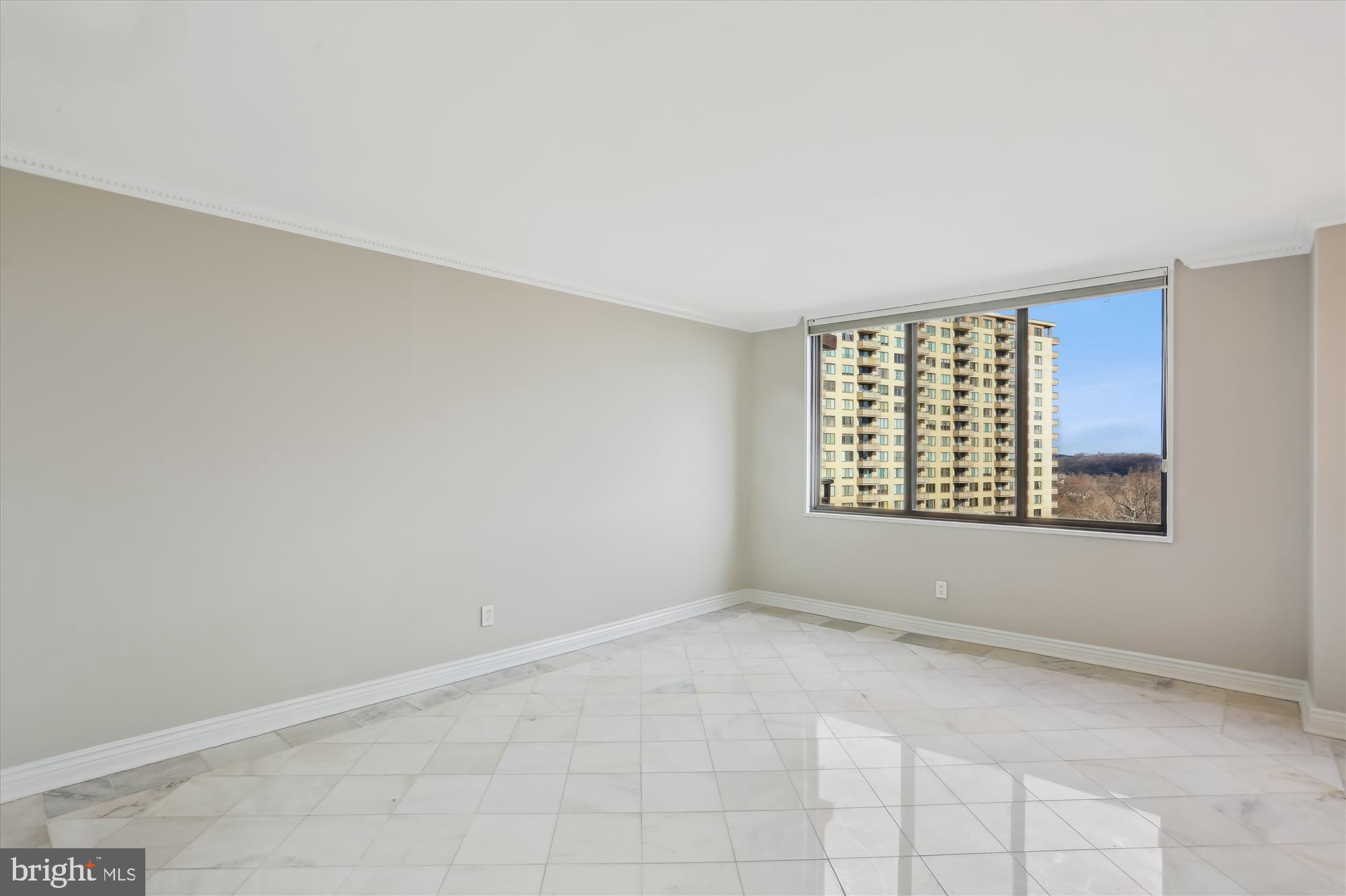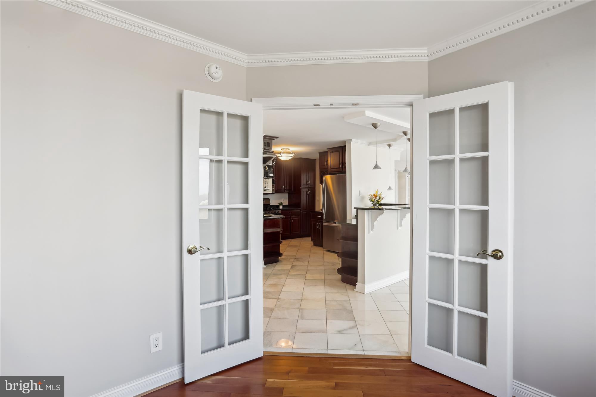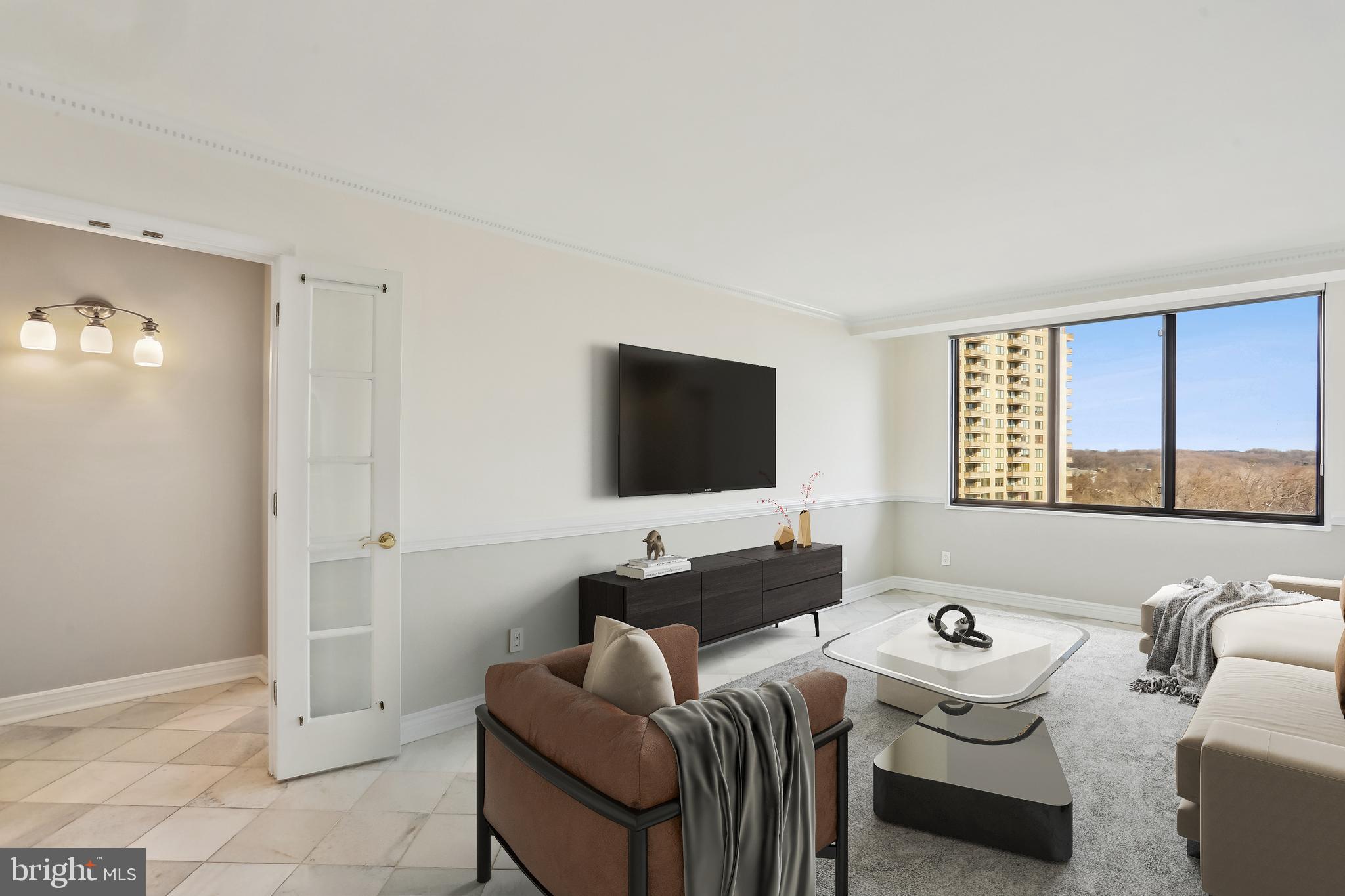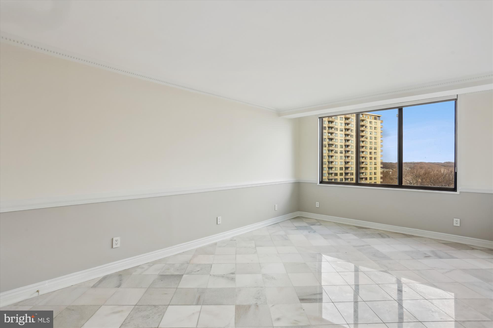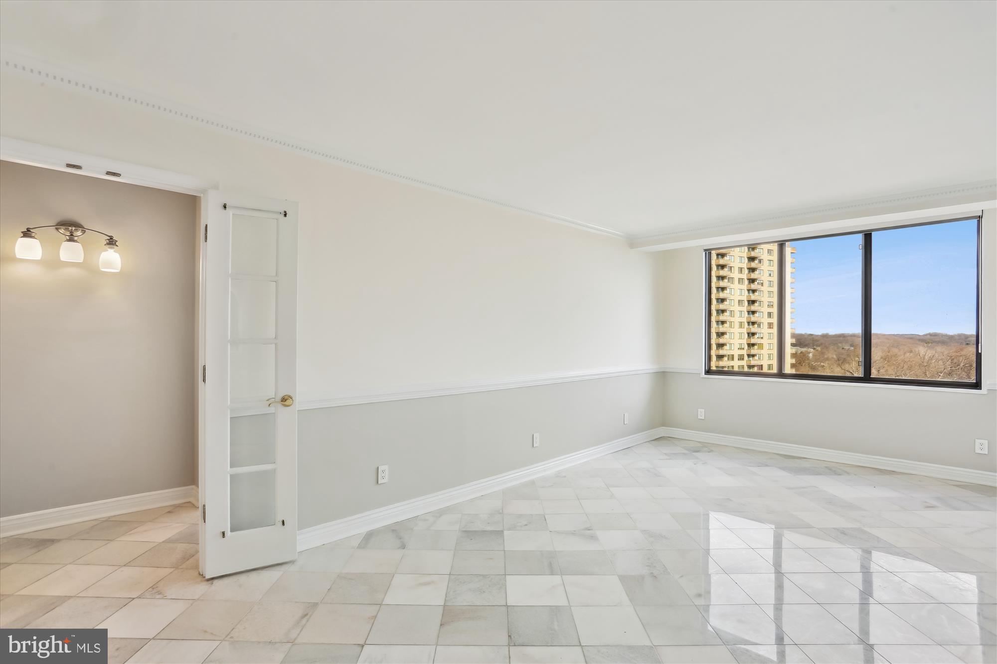 Welcome to The Promenade! Its sought-after location offers year-round resort style living in the heart of Bethesda. As you enter the foyer of this luxurious two bedroom, two bath apartment you will surely be impressed with its open concept living space. The entrance boasts two convenient guest closets with ceramic tile flooring that stretches throughout the main living areas. The sun -filled living room is richly designed with crown molding and is the perfect spot to entertain family and friends. The focal point of the home is the gourmet kitchen, featuring an abundance of custom cherry 42" cabinets that include a built-in pantry, ceramic tile backsplash, granite counter tops, stainless steel appliances (gas cooking) and large breakfast bar with seating for six. Enjoy your first cup of coffee in the dining room adjacent to the kitchen. Its sliding glass door opens to a generous size balcony with a picturesque view of the pool. One of the highlights of this unit is the handsome design of its home office/bonus room with lighted French doors, hardwood floors and built-in cabinets and desk. All anyone would ever need to work from home. The sweeping primary bedroom suite is extraordinary....brand new upgraded carpet, crown molding, recessed lights, spacious sitting room and sleeping room with ceiling fan with light and sliding glass door with second balcony. The closets in this suite are unbelievable with mirrored door closet, huge walk-in closet with custom built-ins and an additional walk-in closet in the primary bath. The luxury ceramic tile bath boasts a cherry vanity with double bowl sink with granite top and tub/shower. The second bedroom on the opposite side of the apartment is equally well appointed. Lighted French door welcomes you to this spacious bedroom with ceramic tile flooring, wall sconces, spacious walk-in closet, large window that floods the room with natural light and a second private bath. The bath features a long cherry vanity with a single sink with granite top and glass enclosed tub/shower. With its neutral decor and fresh paint this nearly 2000 sq. ft. apartment is ready for the buyer that demands perfection. Plenty of natural light and modern finishes complement the overall look and feel in this elegant unit. In addition, there are two of the best garage spaces in the building near the South elevator. The monthly fee includes property taxes, all utilities, basic cable, and access to amenities. The resort-style Promenade complex offers a vast array of amenities...indoor and outdoor pools, tennis and pickleball courts, state of the art fitness center, community garden, library, etc. The retail arcade includes Chef Tony's restaurant, grocery store/deli, dry cleaners, travel agent, and beauty salon. Don't miss your opportunity to experience luxury living, beautiful views, and unmatched amenities. The Promenade has it all!