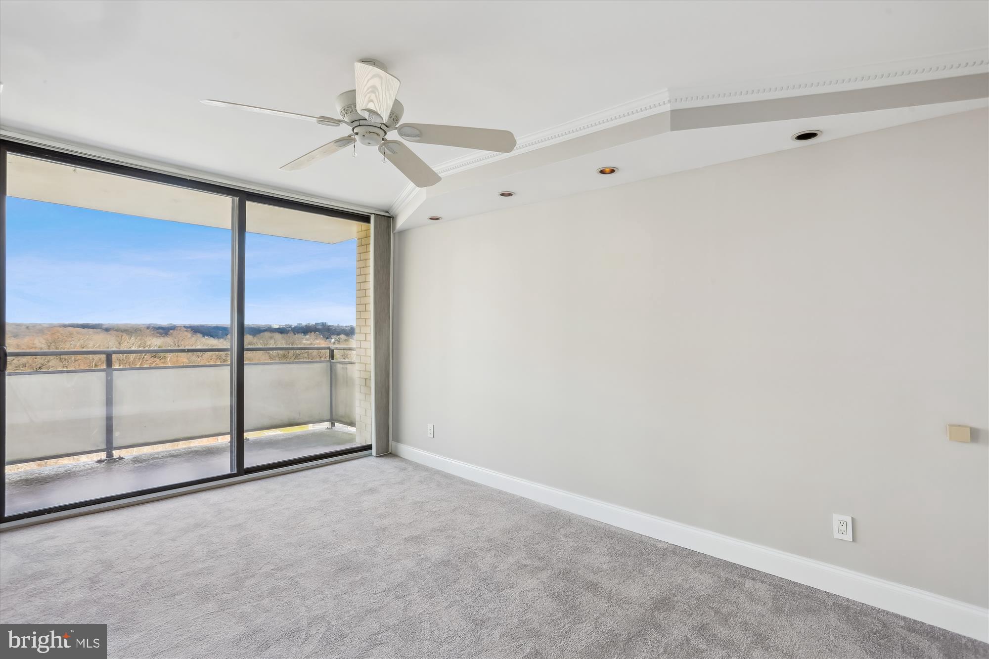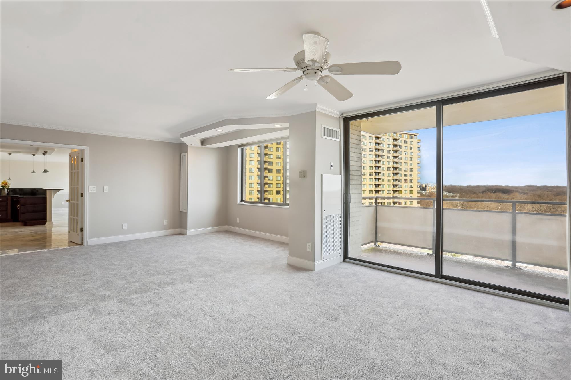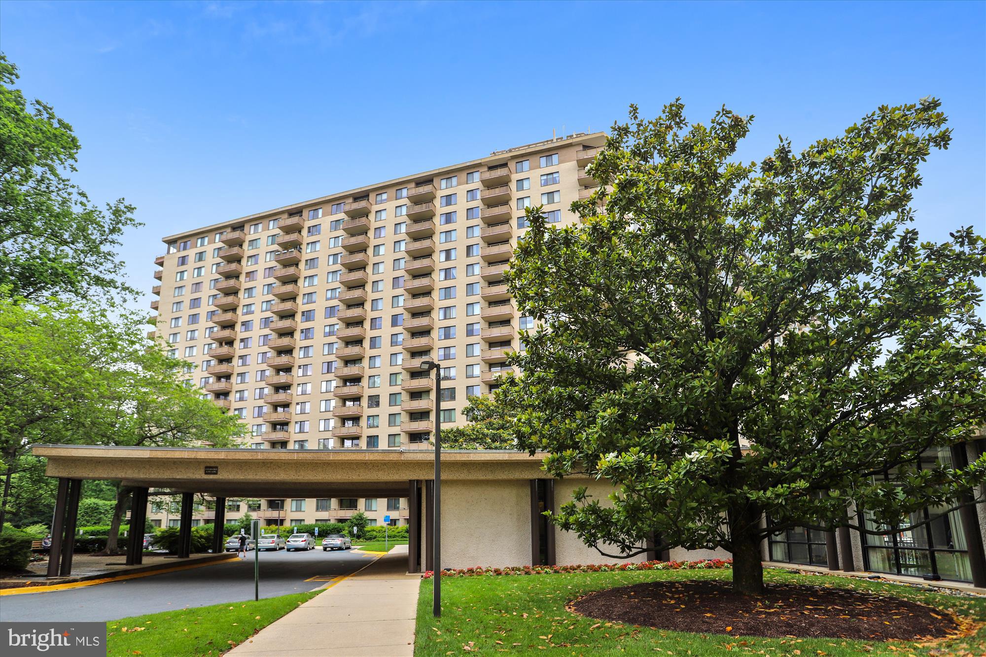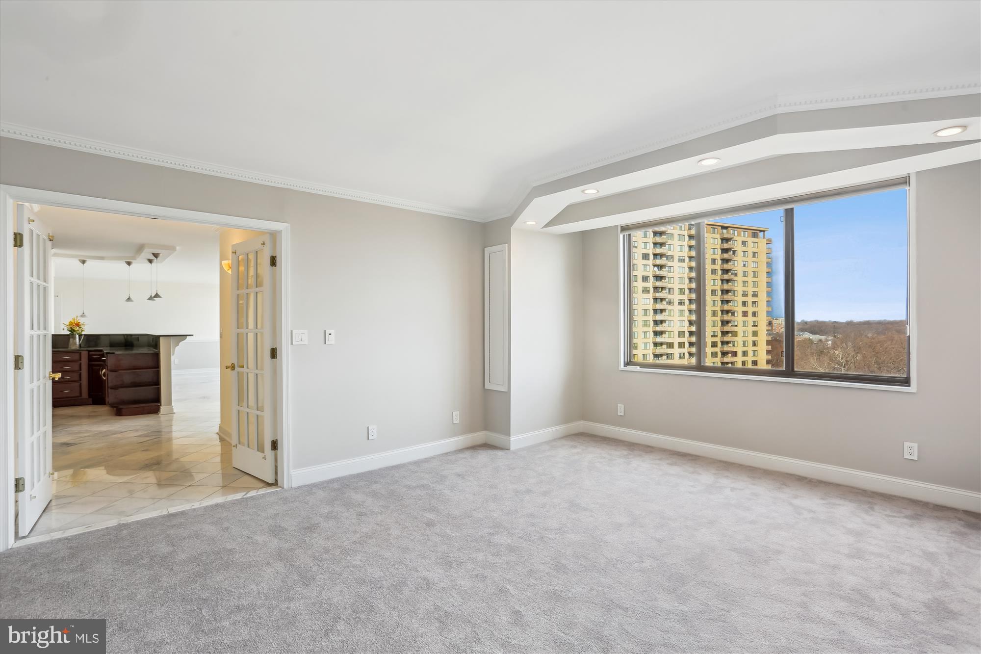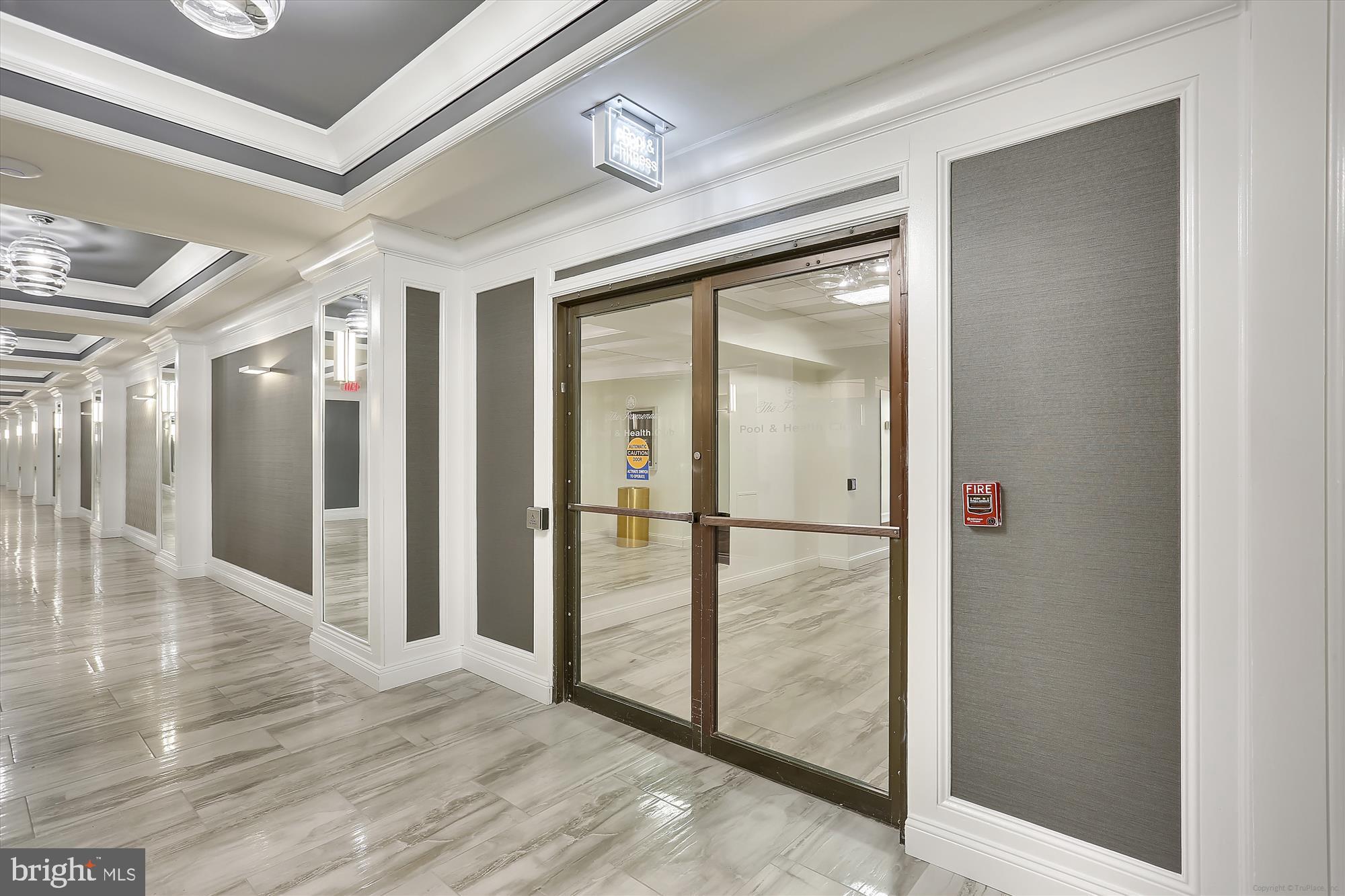 Welcome to The Promenade! Its sought-after location offers year-round resort style living in the heart of Bethesda. As you enter the foyer of this luxurious two bedroom, two bath apartment you will surely be impressed with its open concept living space. The entrance boasts two convenient guest closets with ceramic tile flooring that stretches throughout the main living areas. The sun -filled living room is richly designed with crown molding and is the perfect spot to entertain family and friends. The focal point of the home is the gourmet kitchen, featuring an abundance of custom cherry 42" cabinets that include a built-in pantry, ceramic tile backsplash, granite counter tops, stainless steel appliances (gas cooking) and large breakfast bar with seating for six. Enjoy your first cup of coffee in the dining room adjacent to the kitchen. Its sliding glass door opens to a generous size balcony with a picturesque view of the pool. One of the highlights of this unit is the handsome design of its home office/bonus room with lighted French doors, hardwood floors and built-in cabinets and desk. All anyone would ever need to work from home. The sweeping primary bedroom suite is extraordinary....brand new upgraded carpet, crown molding, recessed lights, spacious sitting room and sleeping room with ceiling fan with light and sliding glass door with second balcony. The closets in this suite are unbelievable with mirrored door closet, huge walk-in closet with custom built-ins and an additional walk-in closet in the primary bath. The luxury ceramic tile bath boasts a cherry vanity with double bowl sink with granite top and tub/shower. The second bedroom on the opposite side of the apartment is equally well appointed. Lighted French door welcomes you to this spacious bedroom with ceramic tile flooring, wall sconces, spacious walk-in closet, large window that floods the room with natural light and a second private bath. The bath features a long cherry vanity with a single sink with granite top and glass enclosed tub/shower. With its neutral decor and fresh paint this nearly 2000 sq. ft. apartment is ready for the buyer that demands perfection. Plenty of natural light and modern finishes complement the overall look and feel in this elegant unit. In addition, there are two of the best garage spaces in the building near the South elevator. The monthly fee includes property taxes, all utilities, basic cable, and access to amenities. The resort-style Promenade complex offers a vast array of amenities...indoor and outdoor pools, tennis and pickleball courts, state of the art fitness center, community garden, library, etc. The retail arcade includes Chef Tony's restaurant, grocery store/deli, dry cleaners, travel agent, and beauty salon. Don't miss your opportunity to experience luxury living, beautiful views, and unmatched amenities. The Promenade has it all!