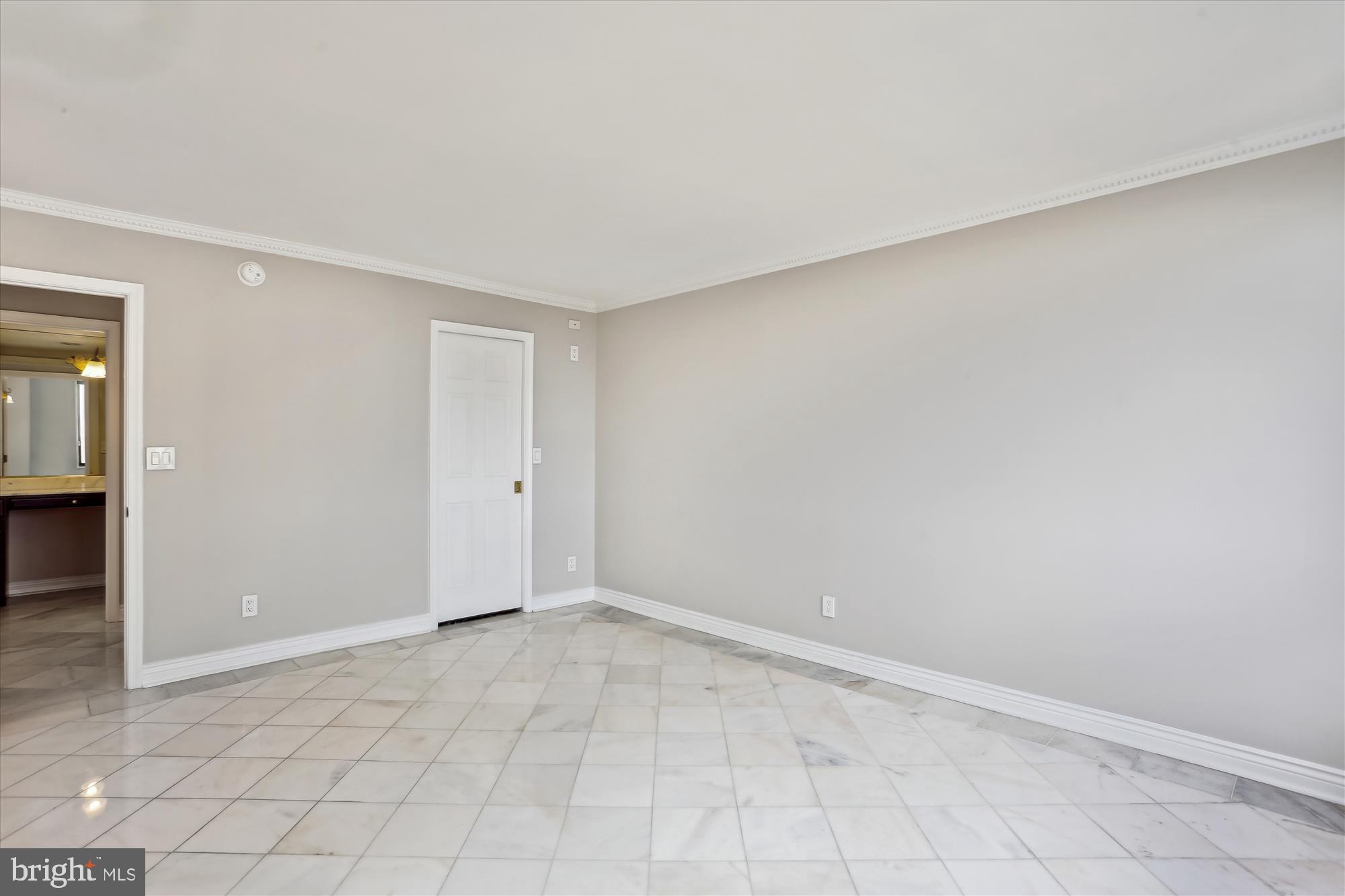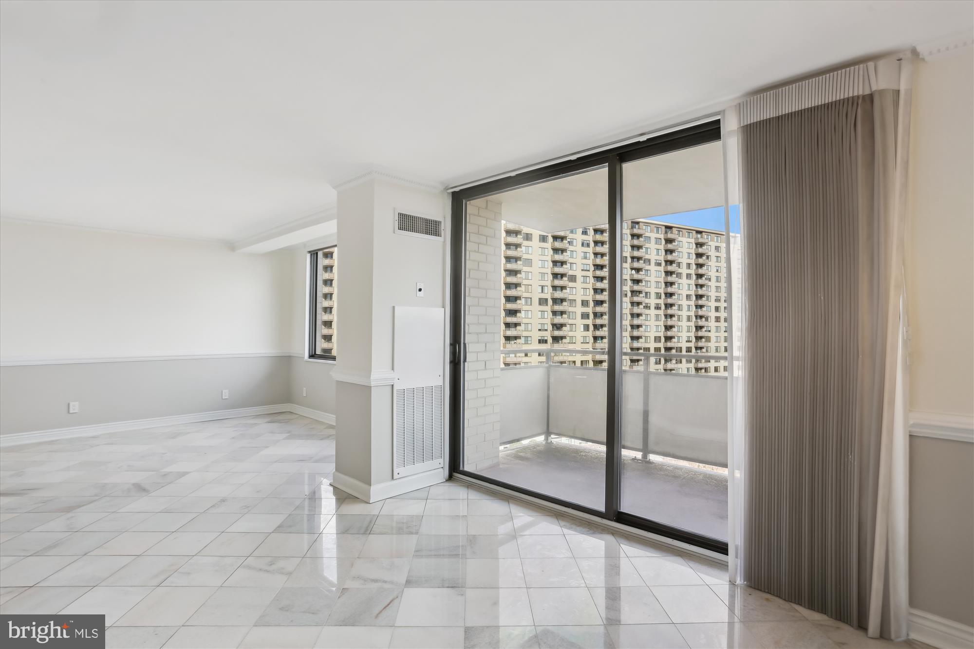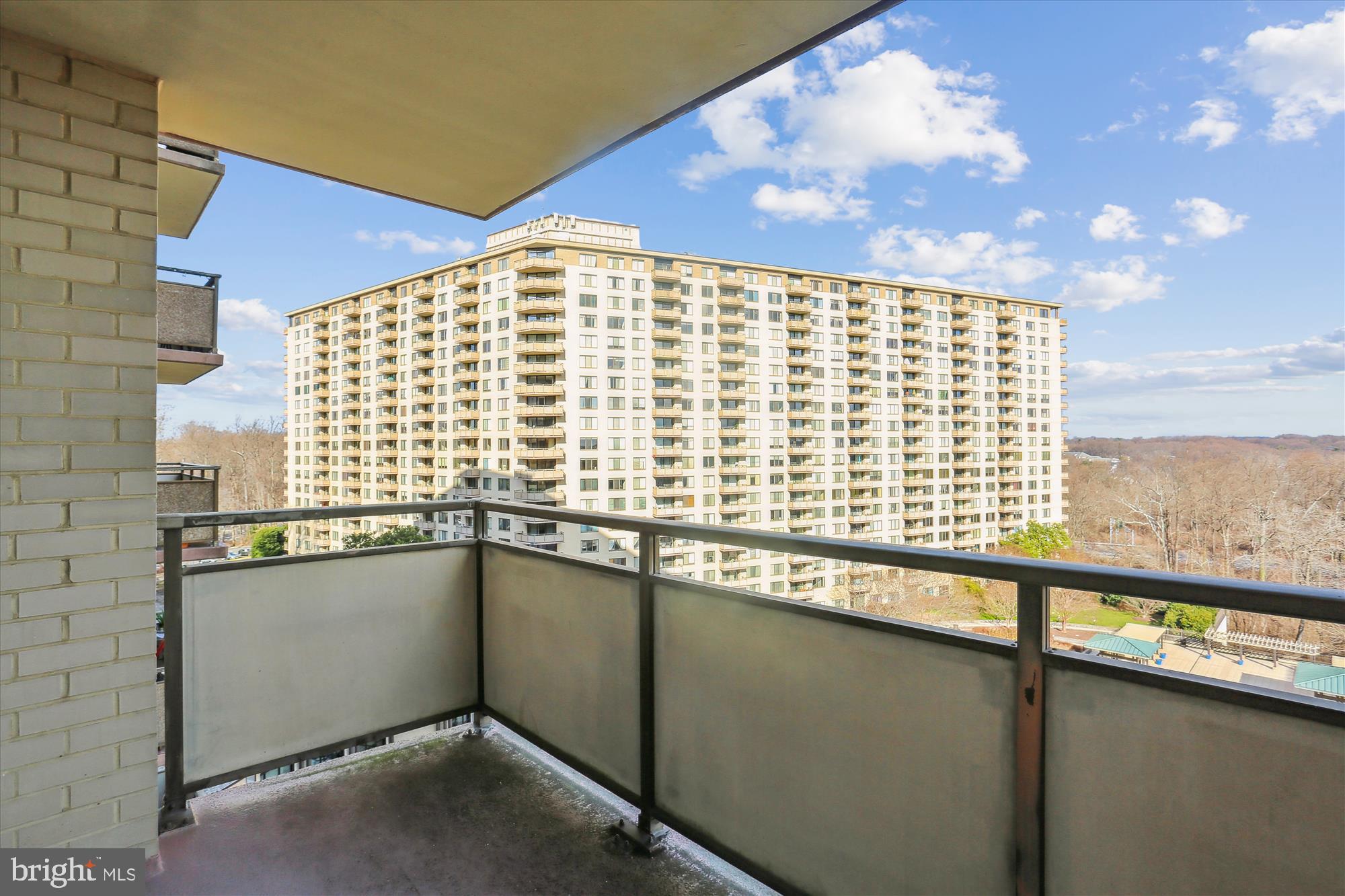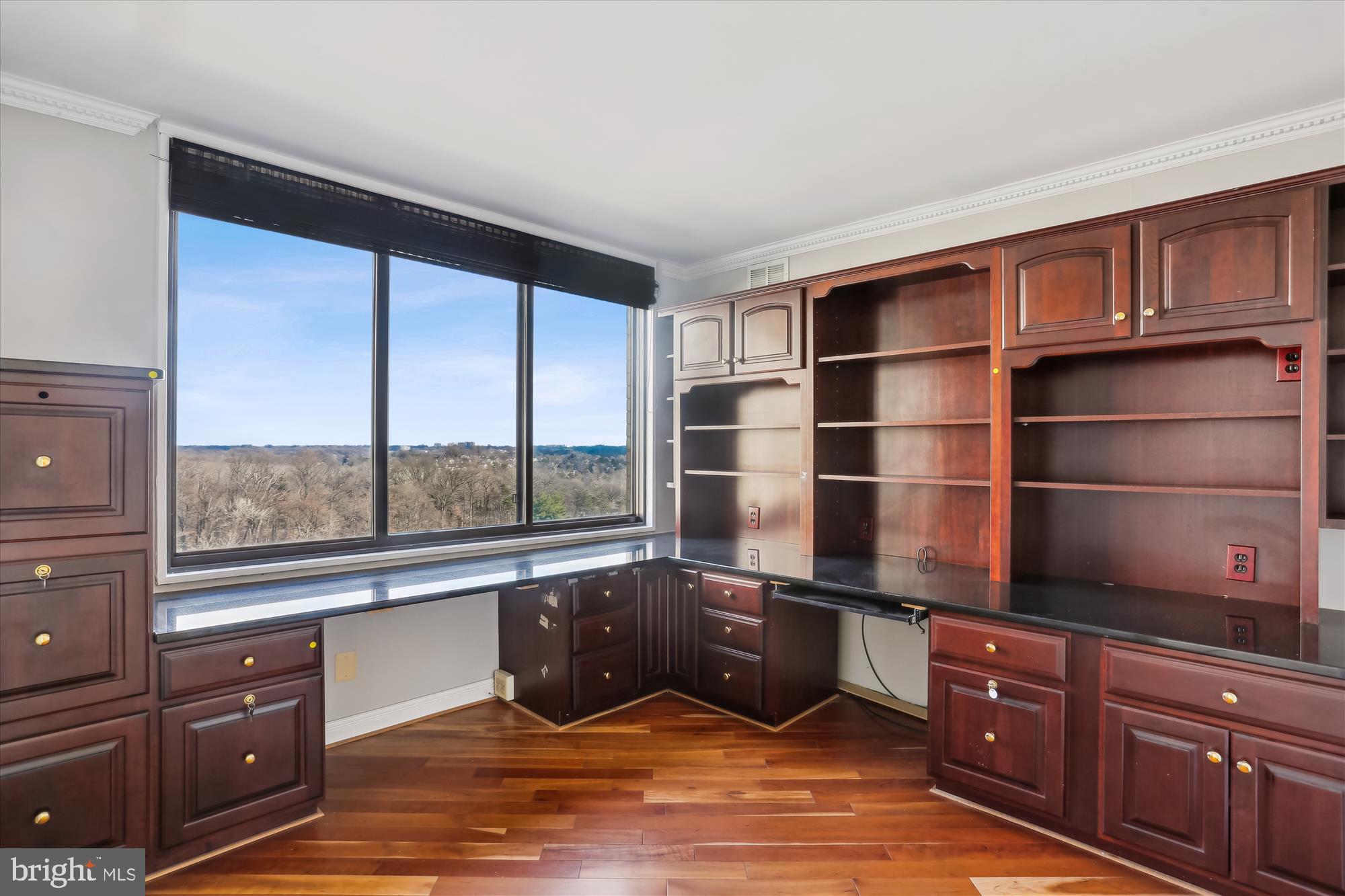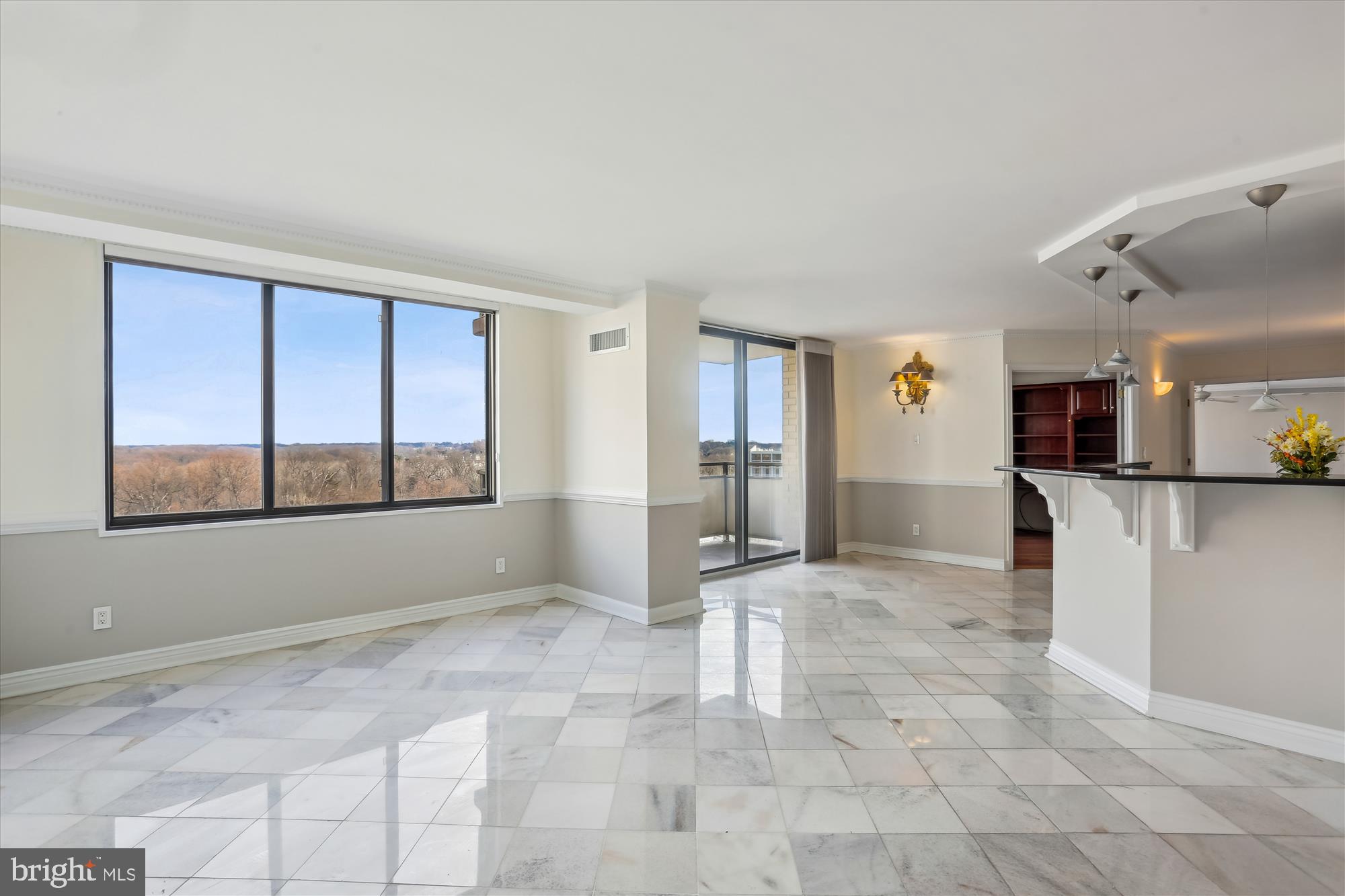 Welcome to The Promenade! Its sought-after location offers year-round resort style living in the heart of Bethesda. As you enter the foyer of this luxurious two bedroom, two bath apartment you will surely be impressed with its open concept living space. The entrance boasts two convenient guest closets with ceramic tile flooring that stretches throughout the main living areas. The sun -filled living room is richly designed with crown molding and is the perfect spot to entertain family and friends. The focal point of the home is the gourmet kitchen, featuring an abundance of custom cherry 42" cabinets that include a built-in pantry, ceramic tile backsplash, granite counter tops, stainless steel appliances (gas cooking) and large breakfast bar with seating for six. Enjoy your first cup of coffee in the dining room adjacent to the kitchen. Its sliding glass door opens to a generous size balcony with a picturesque view of the pool. One of the highlights of this unit is the handsome design of its home office/bonus room with lighted French doors, hardwood floors and built-in cabinets and desk. All anyone would ever need to work from home. The sweeping primary bedroom suite is extraordinary....brand new upgraded carpet, crown molding, recessed lights, spacious sitting room and sleeping room with ceiling fan with light and sliding glass door with second balcony. The closets in this suite are unbelievable with mirrored door closet, huge walk-in closet with custom built-ins and an additional walk-in closet in the primary bath. The luxury ceramic tile bath boasts a cherry vanity with double bowl sink with granite top and tub/shower. The second bedroom on the opposite side of the apartment is equally well appointed. Lighted French door welcomes you to this spacious bedroom with ceramic tile flooring, wall sconces, spacious walk-in closet, large window that floods the room with natural light and a second private bath. The bath features a long cherry vanity with a single sink with granite top and glass enclosed tub/shower. With its neutral decor and fresh paint this nearly 2000 sq. ft. apartment is ready for the buyer that demands perfection. Plenty of natural light and modern finishes complement the overall look and feel in this elegant unit. In addition, there are two of the best garage spaces in the building near the South elevator. The monthly fee includes property taxes, all utilities, basic cable, and access to amenities. The resort-style Promenade complex offers a vast array of amenities...indoor and outdoor pools, tennis and pickleball courts, state of the art fitness center, community garden, library, etc. The retail arcade includes Chef Tony's restaurant, grocery store/deli, dry cleaners, travel agent, and beauty salon. Don't miss your opportunity to experience luxury living, beautiful views, and unmatched amenities. The Promenade has it all!
