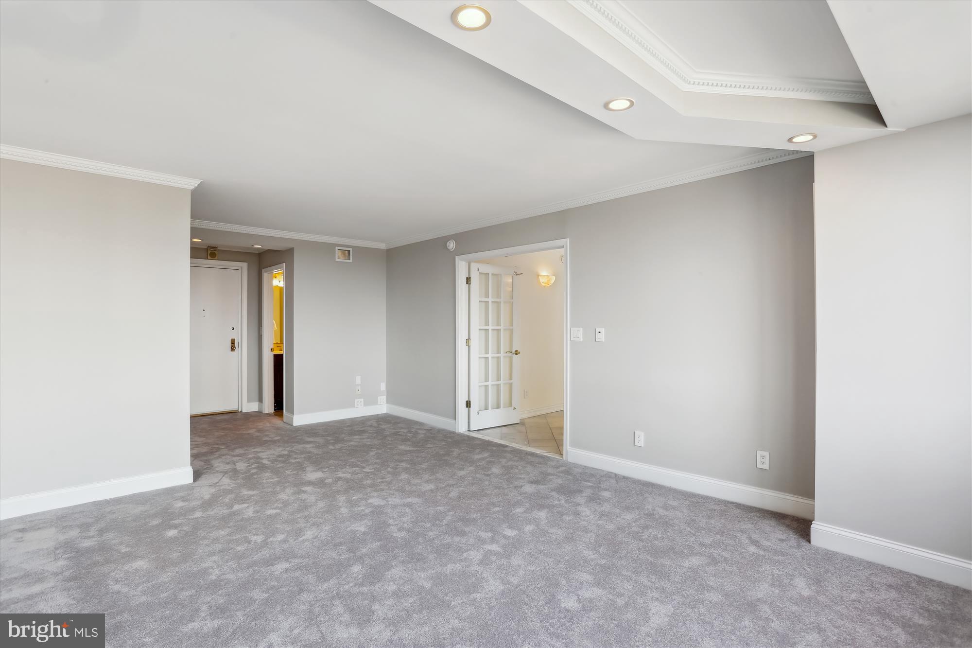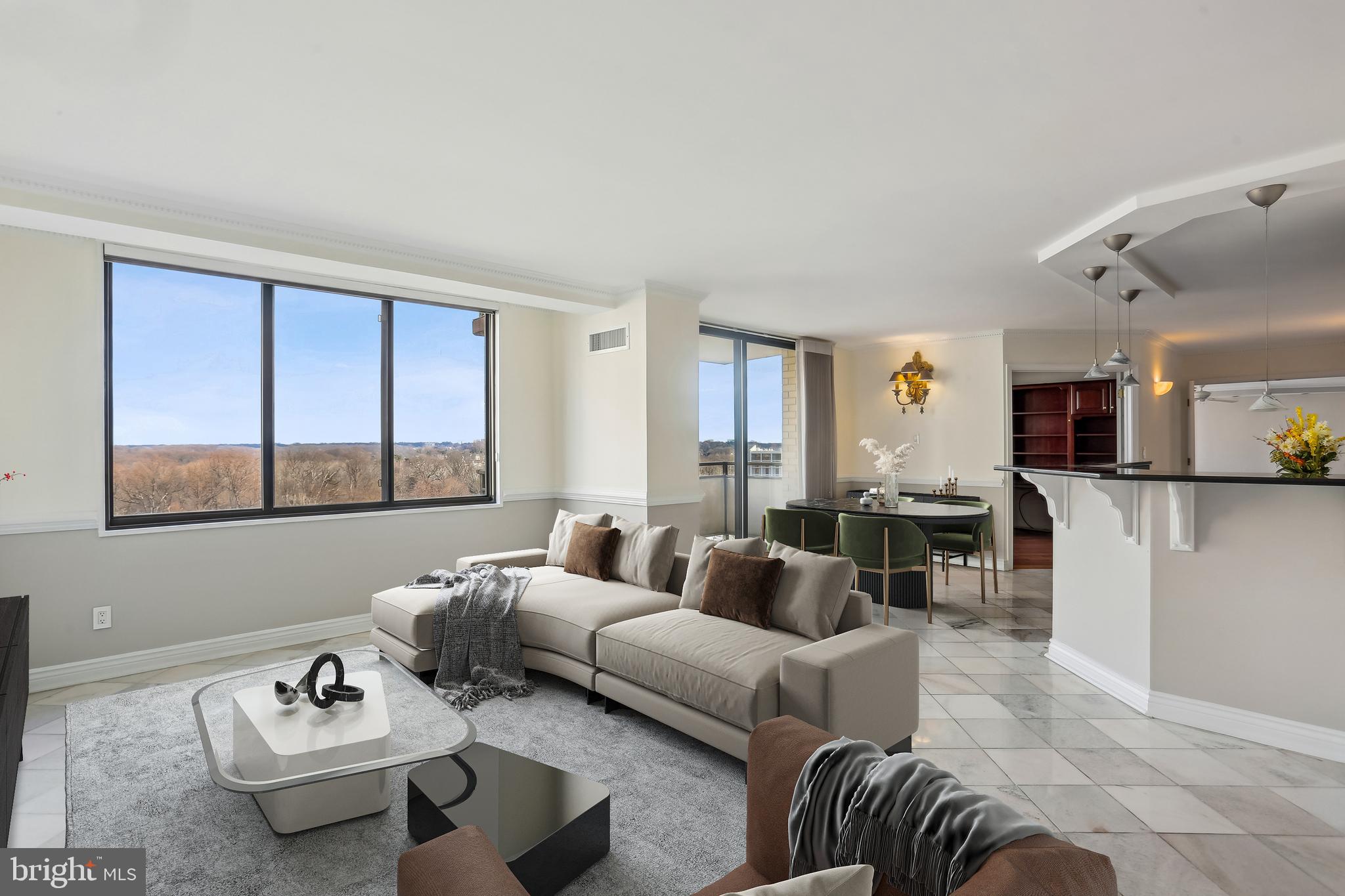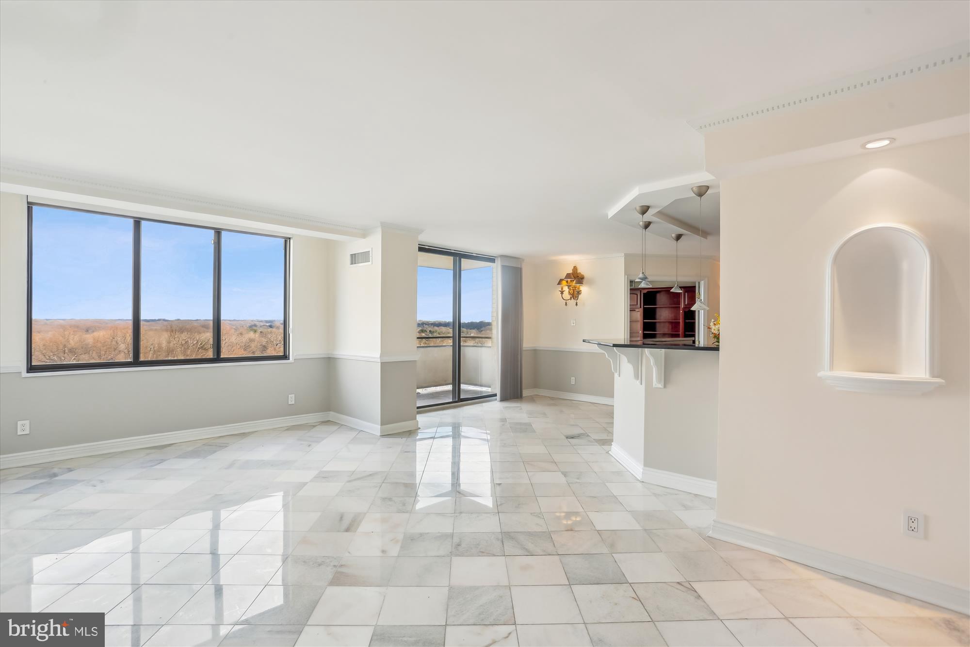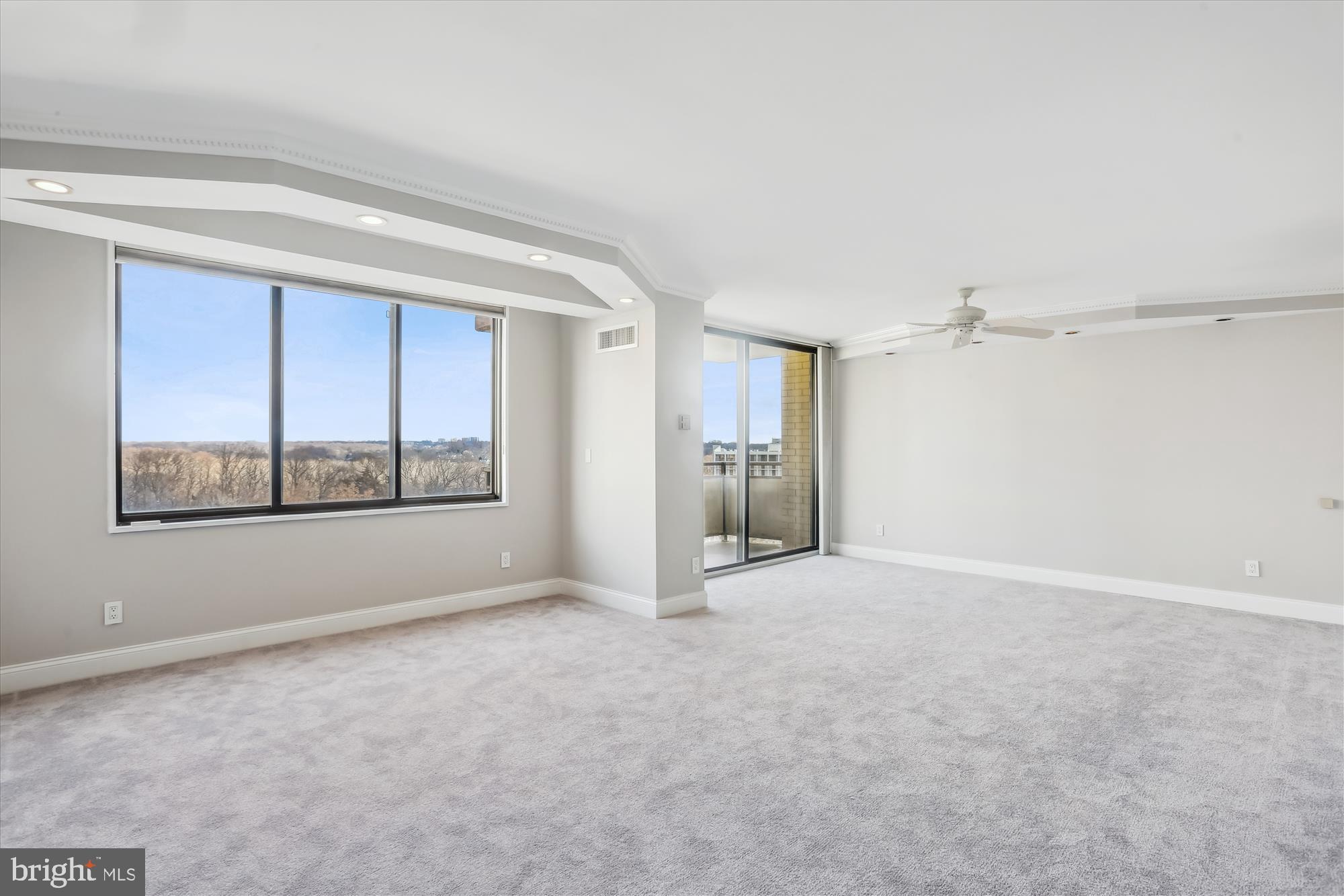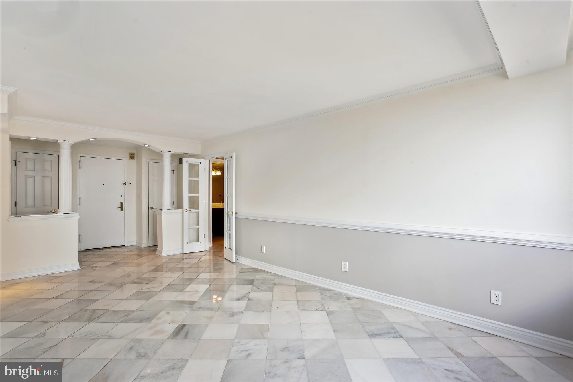 Welcome to The Promenade! Its sought-after location offers year-round resort style living in the heart of Bethesda. As you enter the foyer of this luxurious two bedroom, two bath apartment you will surely be impressed with its open concept living space. The entrance boasts two convenient guest closets with ceramic tile flooring that stretches throughout the main living areas. The sun -filled living room is richly designed with crown molding and is the perfect spot to entertain family and friends. The focal point of the home is the gourmet kitchen, featuring an abundance of custom cherry 42" cabinets that include a built-in pantry, ceramic tile backsplash, granite counter tops, stainless steel appliances (gas cooking) and large breakfast bar with seating for six. Enjoy your first cup of coffee in the dining room adjacent to the kitchen. Its sliding glass door opens to a generous size balcony with a picturesque view of the pool. One of the highlights of this unit is the handsome design of its home office/bonus room with lighted French doors, hardwood floors and built-in cabinets and desk. All anyone would ever need to work from home. The sweeping primary bedroom suite is extraordinary....brand new upgraded carpet, crown molding, recessed lights, spacious sitting room and sleeping room with ceiling fan with light and sliding glass door with second balcony. The closets in this suite are unbelievable with mirrored door closet, huge walk-in closet with custom built-ins and an additional walk-in closet in the primary bath. The luxury ceramic tile bath boasts a cherry vanity with double bowl sink with granite top and tub/shower. The second bedroom on the opposite side of the apartment is equally well appointed. Lighted French door welcomes you to this spacious bedroom with ceramic tile flooring, wall sconces, spacious walk-in closet, large window that floods the room with natural light and a second private bath. The bath features a long cherry vanity with a single sink with granite top and glass enclosed tub/shower. With its neutral decor and fresh paint this nearly 2000 sq. ft. apartment is ready for the buyer that demands perfection. Plenty of natural light and modern finishes complement the overall look and feel in this elegant unit. In addition, there are two of the best garage spaces in the building near the South elevator. The monthly fee includes property taxes, all utilities, basic cable, and access to amenities. The resort-style Promenade complex offers a vast array of amenities...indoor and outdoor pools, tennis and pickleball courts, state of the art fitness center, community garden, library, etc. The retail arcade includes Chef Tony's restaurant, grocery store/deli, dry cleaners, travel agent, and beauty salon. Don't miss your opportunity to experience luxury living, beautiful views, and unmatched amenities. The Promenade has it all!