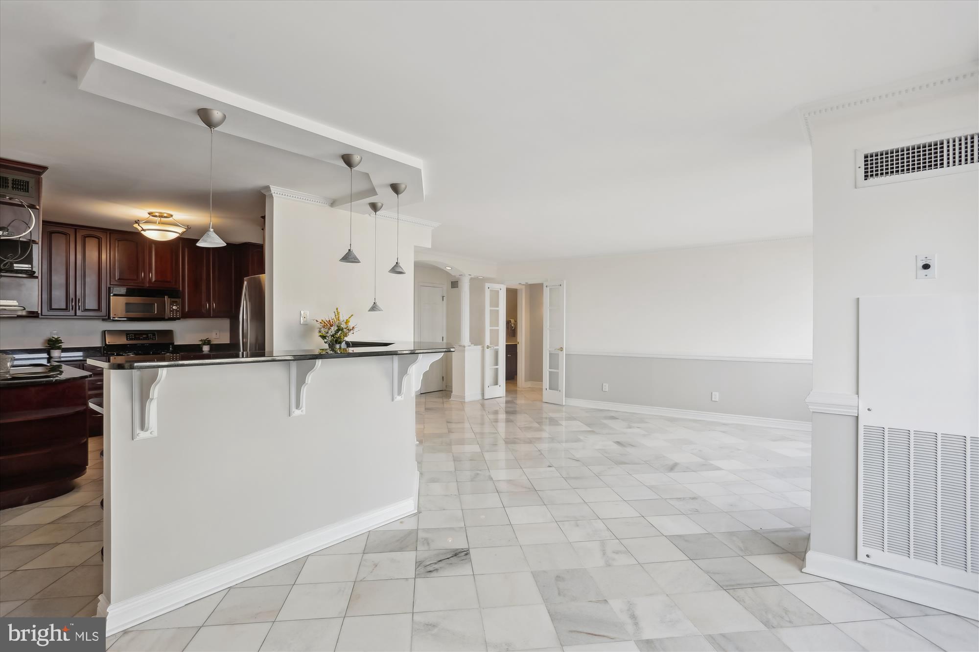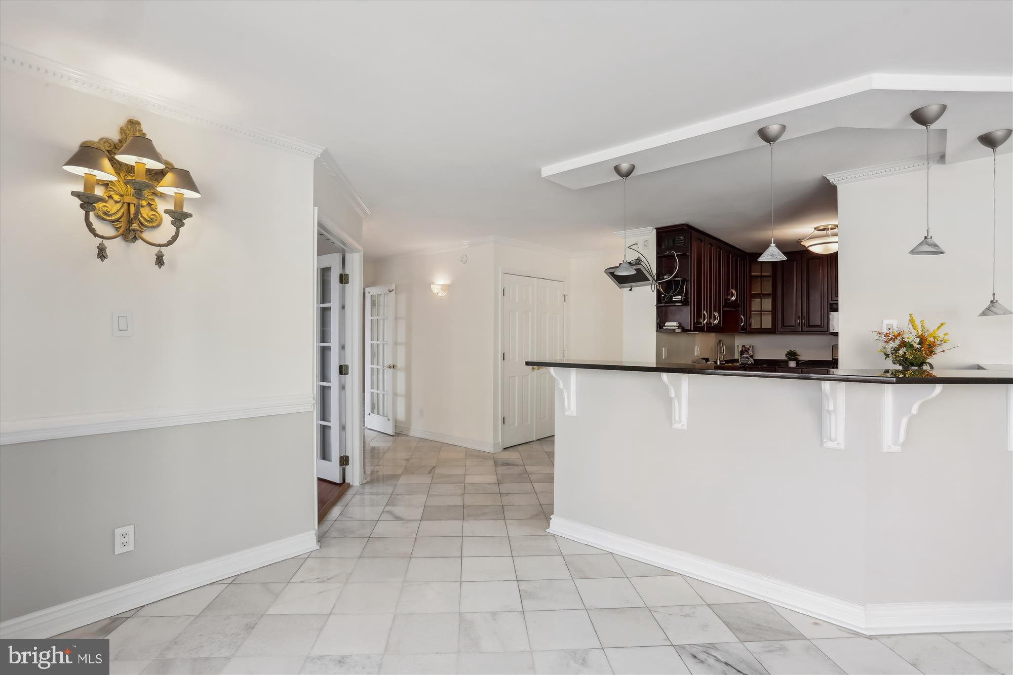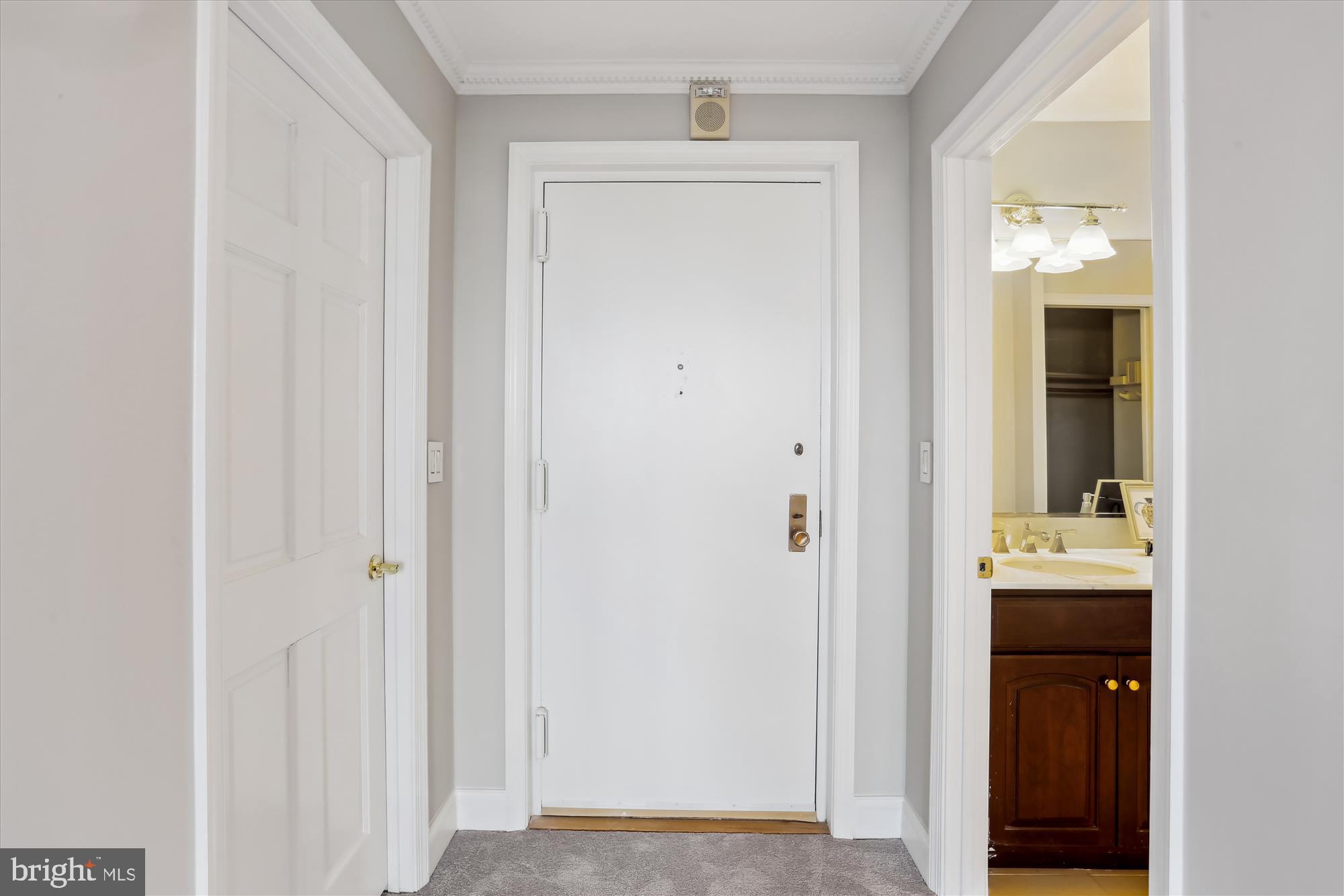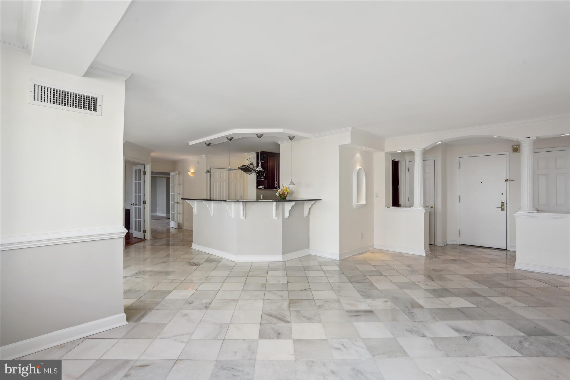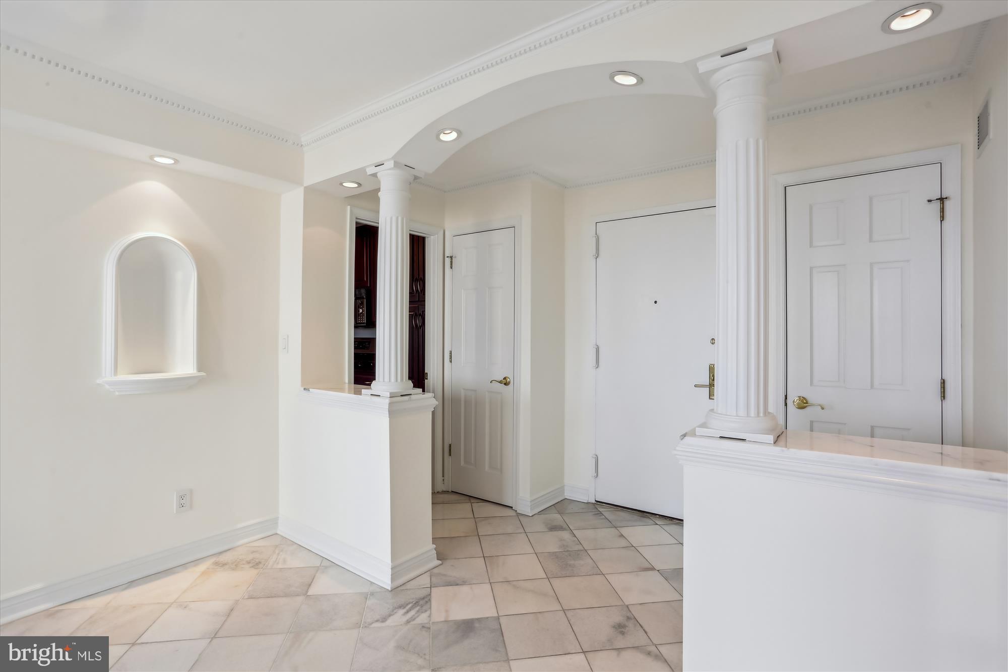 Welcome to The Promenade! Its sought-after location offers year-round resort style living in the heart of Bethesda. As you enter the foyer of this luxurious two bedroom, two bath apartment you will surely be impressed with its open concept living space. The entrance boasts two convenient guest closets with ceramic tile flooring that stretches throughout the main living areas. The sun -filled living room is richly designed with crown molding and is the perfect spot to entertain family and friends. The focal point of the home is the gourmet kitchen, featuring an abundance of custom cherry 42" cabinets that include a built-in pantry, ceramic tile backsplash, granite counter tops, stainless steel appliances (gas cooking) and large breakfast bar with seating for six. Enjoy your first cup of coffee in the dining room adjacent to the kitchen. Its sliding glass door opens to a generous size balcony with a picturesque view of the pool. One of the highlights of this unit is the handsome design of its home office/bonus room with lighted French doors, hardwood floors and built-in cabinets and desk. All anyone would ever need to work from home. The sweeping primary bedroom suite is extraordinary....brand new upgraded carpet, crown molding, recessed lights, spacious sitting room and sleeping room with ceiling fan with light and sliding glass door with second balcony. The closets in this suite are unbelievable with mirrored door closet, huge walk-in closet with custom built-ins and an additional walk-in closet in the primary bath. The luxury ceramic tile bath boasts a cherry vanity with double bowl sink with granite top and tub/shower. The second bedroom on the opposite side of the apartment is equally well appointed. Lighted French door welcomes you to this spacious bedroom with ceramic tile flooring, wall sconces, spacious walk-in closet, large window that floods the room with natural light and a second private bath. The bath features a long cherry vanity with a single sink with granite top and glass enclosed tub/shower. With its neutral decor and fresh paint this nearly 2000 sq. ft. apartment is ready for the buyer that demands perfection. Plenty of natural light and modern finishes complement the overall look and feel in this elegant unit. In addition, there are two of the best garage spaces in the building near the South elevator. The monthly fee includes property taxes, all utilities, basic cable, and access to amenities. The resort-style Promenade complex offers a vast array of amenities...indoor and outdoor pools, tennis and pickleball courts, state of the art fitness center, community garden, library, etc. The retail arcade includes Chef Tony's restaurant, grocery store/deli, dry cleaners, travel agent, and beauty salon. Don't miss your opportunity to experience luxury living, beautiful views, and unmatched amenities. The Promenade has it all!