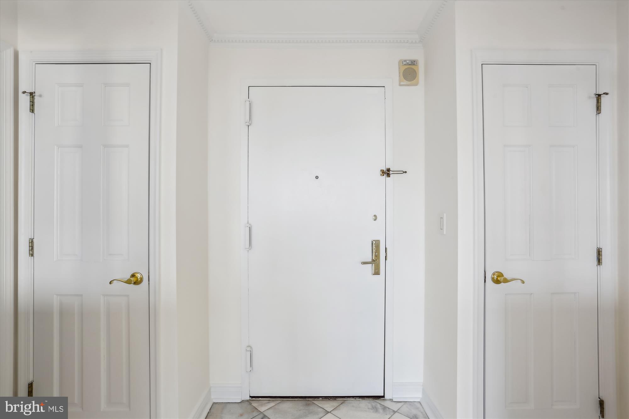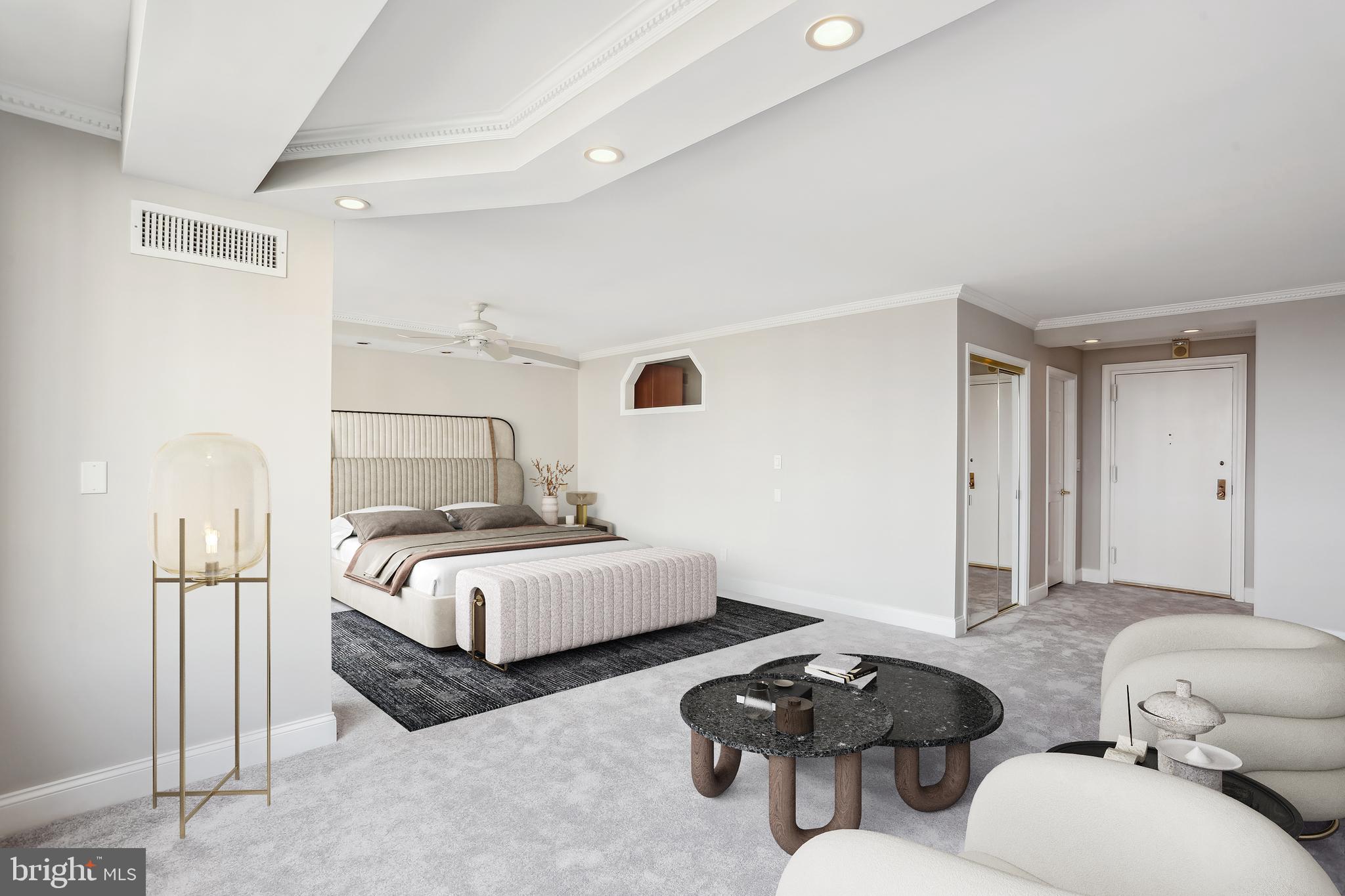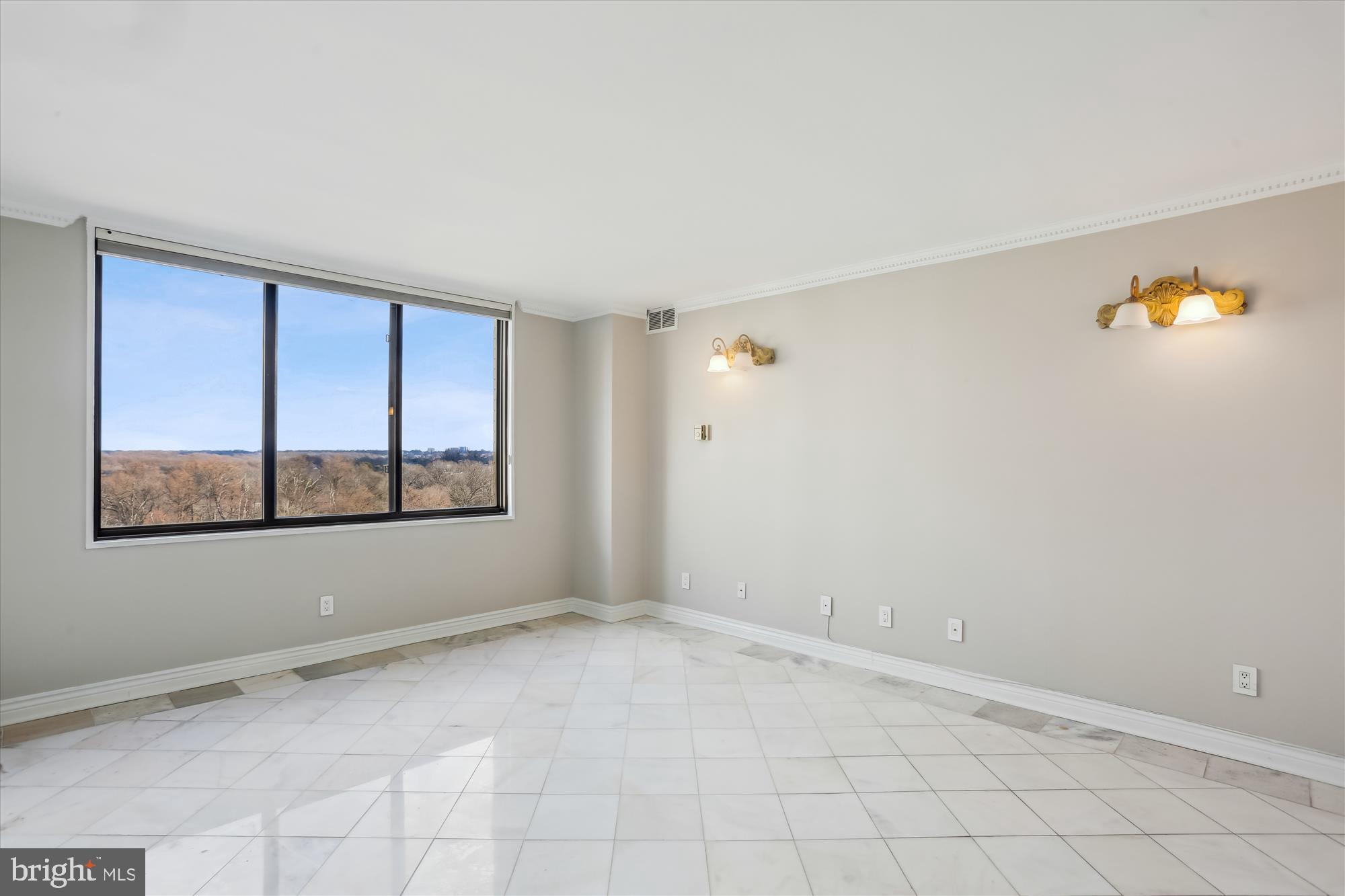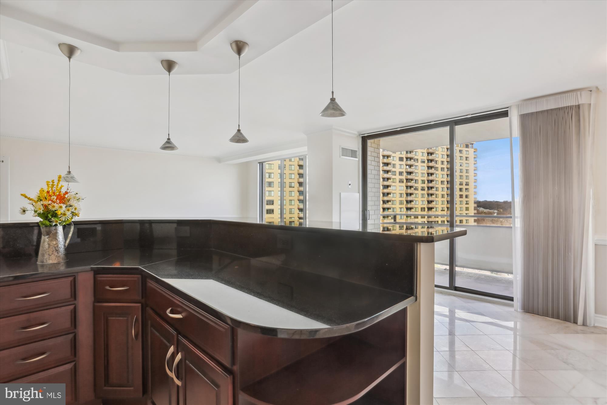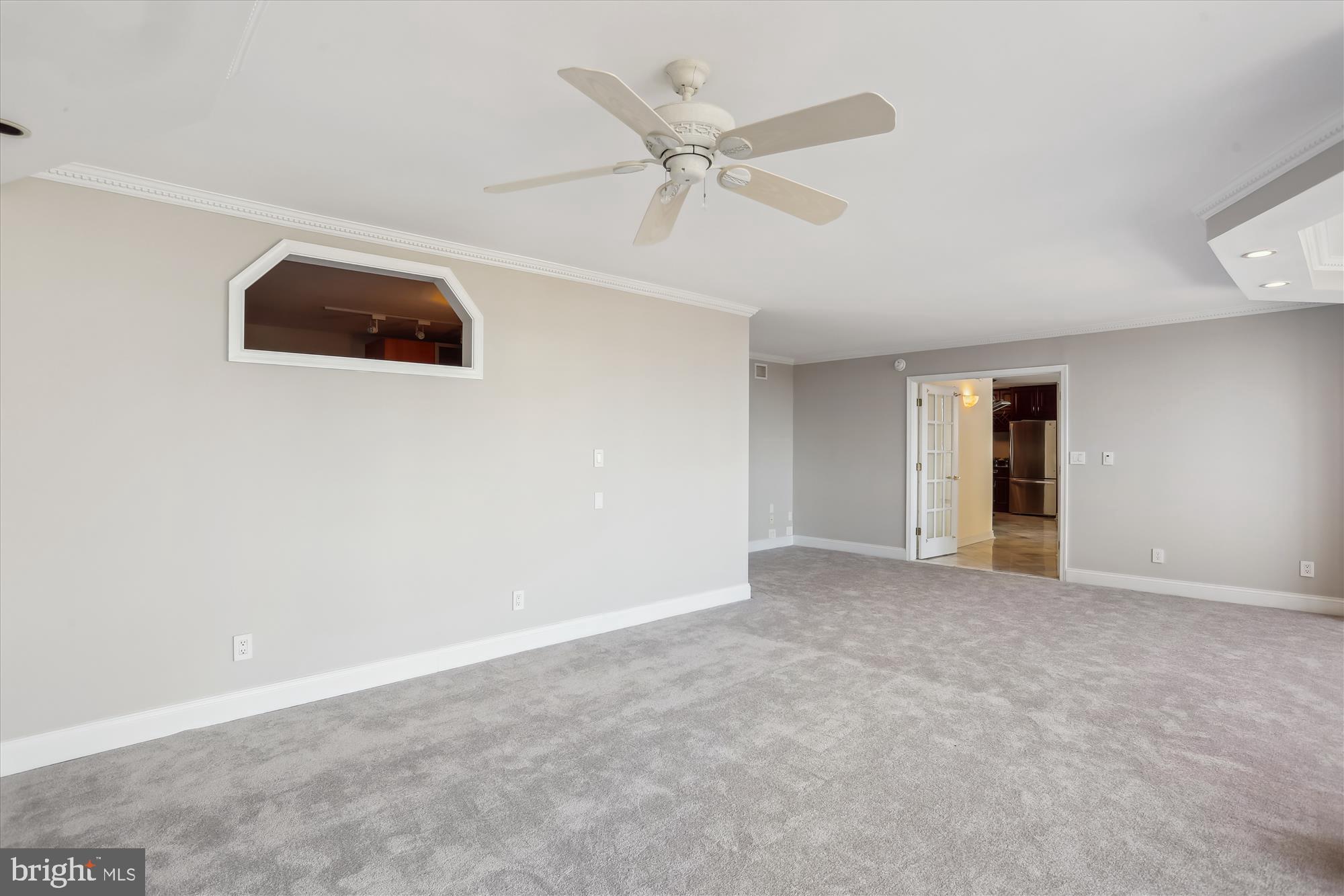 Welcome to The Promenade! Its sought-after location offers year-round resort style living in the heart of Bethesda. As you enter the foyer of this luxurious two bedroom, two bath apartment you will surely be impressed with its open concept living space. The entrance boasts two convenient guest closets with ceramic tile flooring that stretches throughout the main living areas. The sun -filled living room is richly designed with crown molding and is the perfect spot to entertain family and friends. The focal point of the home is the gourmet kitchen, featuring an abundance of custom cherry 42" cabinets that include a built-in pantry, ceramic tile backsplash, granite counter tops, stainless steel appliances (gas cooking) and large breakfast bar with seating for six. Enjoy your first cup of coffee in the dining room adjacent to the kitchen. Its sliding glass door opens to a generous size balcony with a picturesque view of the pool. One of the highlights of this unit is the handsome design of its home office/bonus room with lighted French doors, hardwood floors and built-in cabinets and desk. All anyone would ever need to work from home. The sweeping primary bedroom suite is extraordinary....brand new upgraded carpet, crown molding, recessed lights, spacious sitting room and sleeping room with ceiling fan with light and sliding glass door with second balcony. The closets in this suite are unbelievable with mirrored door closet, huge walk-in closet with custom built-ins and an additional walk-in closet in the primary bath. The luxury ceramic tile bath boasts a cherry vanity with double bowl sink with granite top and tub/shower. The second bedroom on the opposite side of the apartment is equally well appointed. Lighted French door welcomes you to this spacious bedroom with ceramic tile flooring, wall sconces, spacious walk-in closet, large window that floods the room with natural light and a second private bath. The bath features a long cherry vanity with a single sink with granite top and glass enclosed tub/shower. With its neutral decor and fresh paint this nearly 2000 sq. ft. apartment is ready for the buyer that demands perfection. Plenty of natural light and modern finishes complement the overall look and feel in this elegant unit. In addition, there are two of the best garage spaces in the building near the South elevator. The monthly fee includes property taxes, all utilities, basic cable, and access to amenities. The resort-style Promenade complex offers a vast array of amenities...indoor and outdoor pools, tennis and pickleball courts, state of the art fitness center, community garden, library, etc. The retail arcade includes Chef Tony's restaurant, grocery store/deli, dry cleaners, travel agent, and beauty salon. Don't miss your opportunity to experience luxury living, beautiful views, and unmatched amenities. The Promenade has it all!
