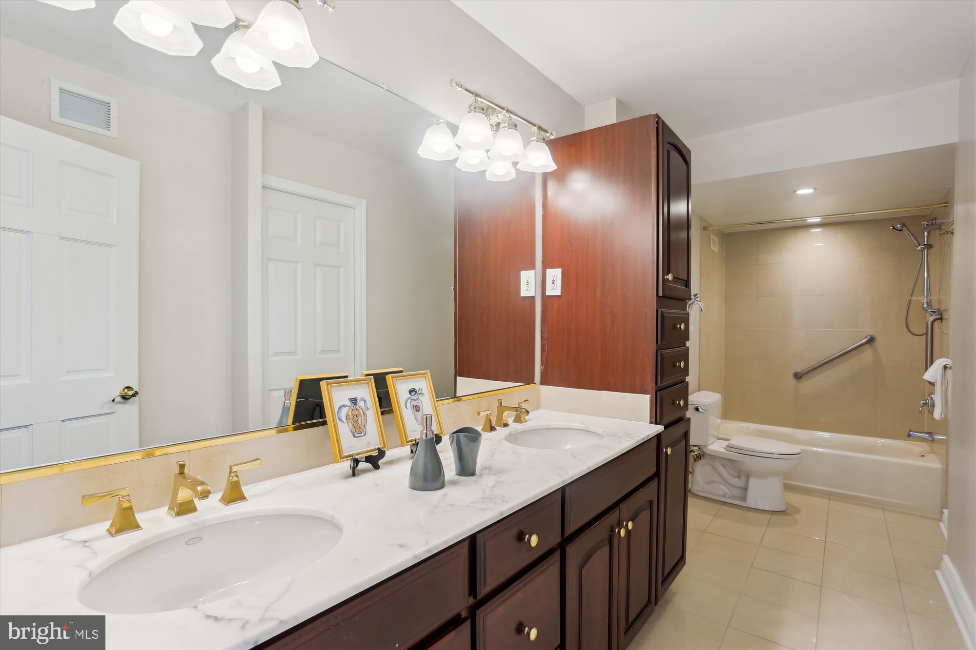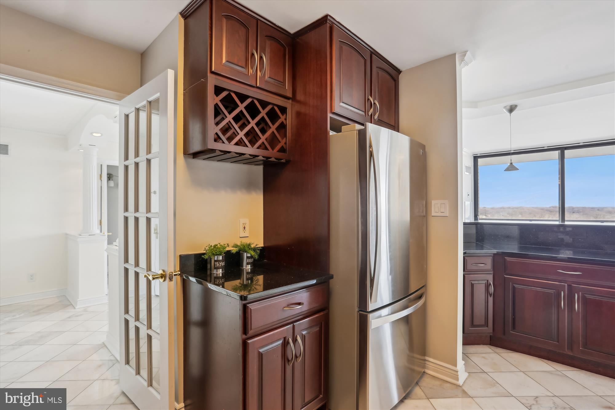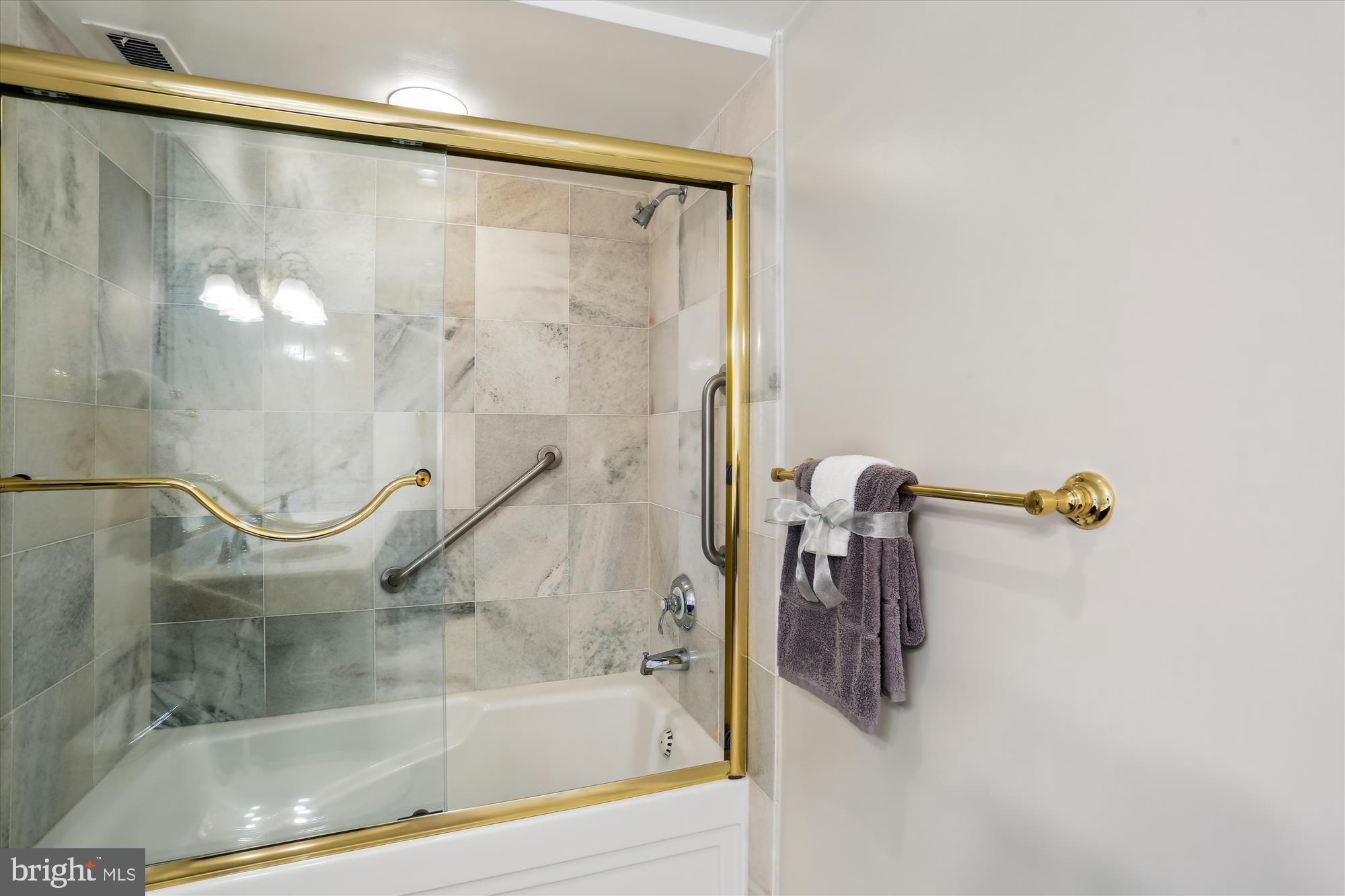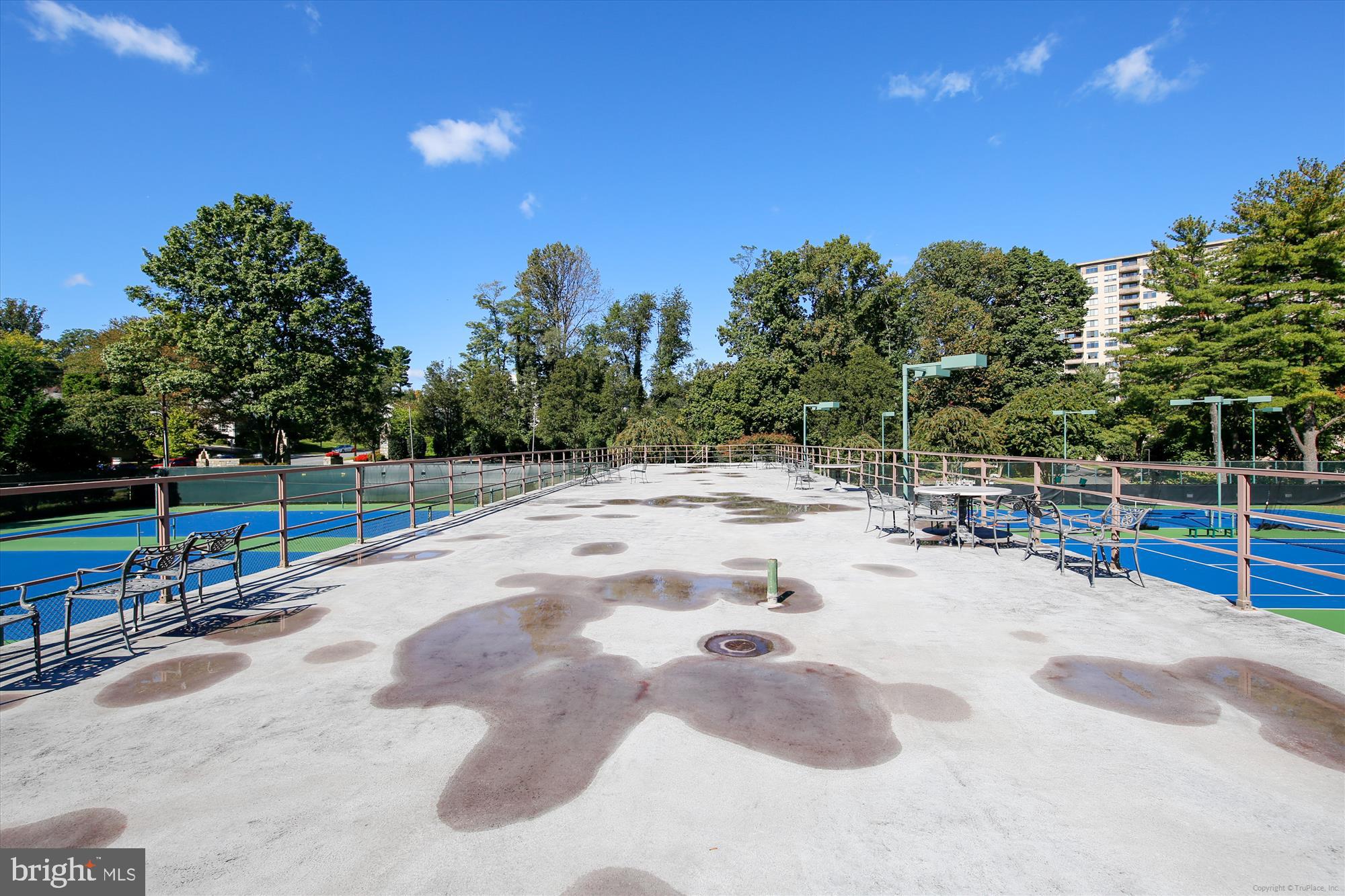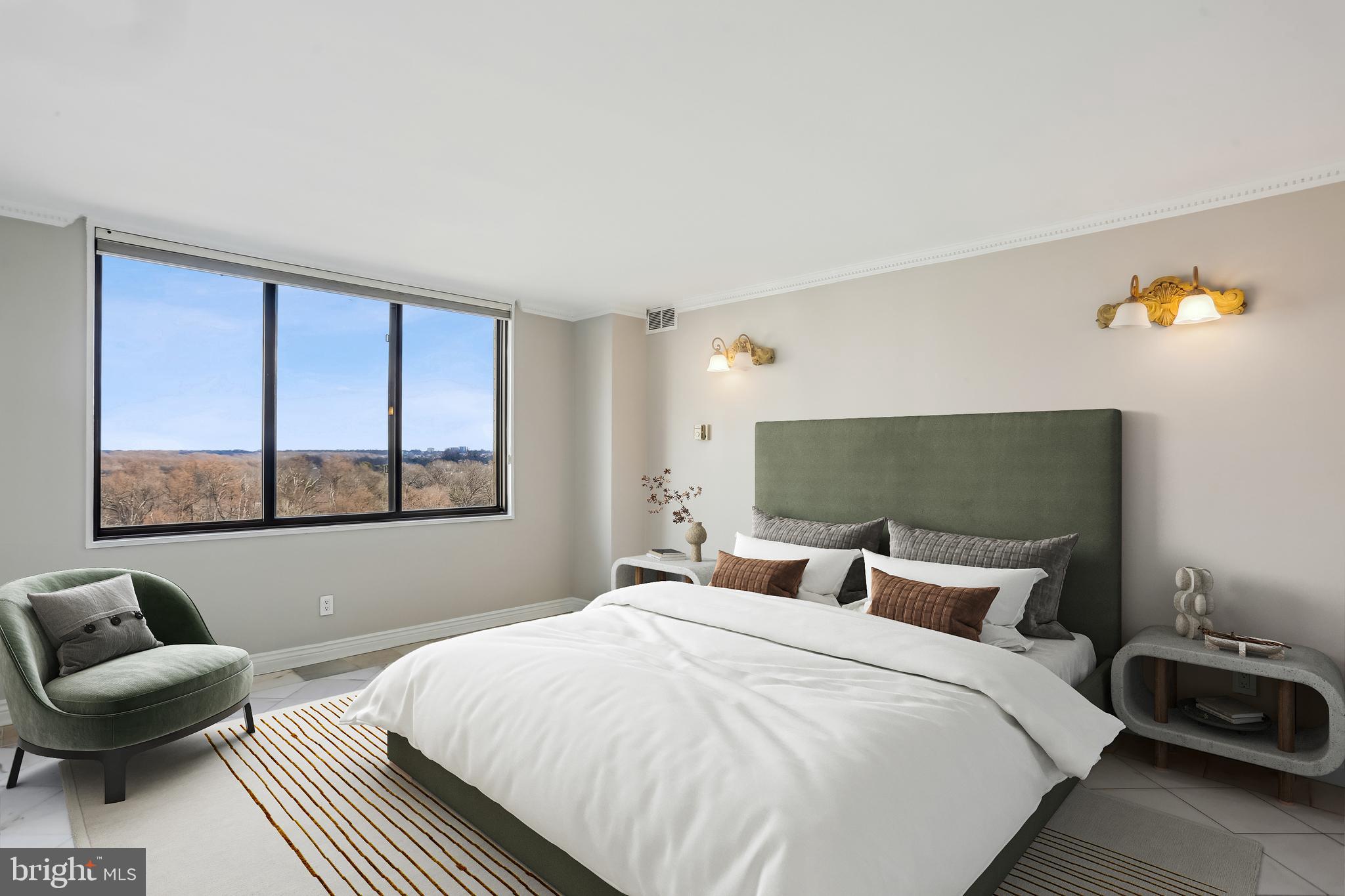 Welcome to The Promenade! Its sought-after location offers year-round resort style living in the heart of Bethesda. As you enter the foyer of this luxurious two bedroom, two bath apartment you will surely be impressed with its open concept living space. The entrance boasts two convenient guest closets with ceramic tile flooring that stretches throughout the main living areas. The sun -filled living room is richly designed with crown molding and is the perfect spot to entertain family and friends. The focal point of the home is the gourmet kitchen, featuring an abundance of custom cherry 42" cabinets that include a built-in pantry, ceramic tile backsplash, granite counter tops, stainless steel appliances (gas cooking) and large breakfast bar with seating for six. Enjoy your first cup of coffee in the dining room adjacent to the kitchen. Its sliding glass door opens to a generous size balcony with a picturesque view of the pool. One of the highlights of this unit is the handsome design of its home office/bonus room with lighted French doors, hardwood floors and built-in cabinets and desk. All anyone would ever need to work from home. The sweeping primary bedroom suite is extraordinary....brand new upgraded carpet, crown molding, recessed lights, spacious sitting room and sleeping room with ceiling fan with light and sliding glass door with second balcony. The closets in this suite are unbelievable with mirrored door closet, huge walk-in closet with custom built-ins and an additional walk-in closet in the primary bath. The luxury ceramic tile bath boasts a cherry vanity with double bowl sink with granite top and tub/shower. The second bedroom on the opposite side of the apartment is equally well appointed. Lighted French door welcomes you to this spacious bedroom with ceramic tile flooring, wall sconces, spacious walk-in closet, large window that floods the room with natural light and a second private bath. The bath features a long cherry vanity with a single sink with granite top and glass enclosed tub/shower. With its neutral decor and fresh paint this nearly 2000 sq. ft. apartment is ready for the buyer that demands perfection. Plenty of natural light and modern finishes complement the overall look and feel in this elegant unit. In addition, there are two of the best garage spaces in the building near the South elevator. The monthly fee includes property taxes, all utilities, basic cable, and access to amenities. The resort-style Promenade complex offers a vast array of amenities...indoor and outdoor pools, tennis and pickleball courts, state of the art fitness center, community garden, library, etc. The retail arcade includes Chef Tony's restaurant, grocery store/deli, dry cleaners, travel agent, and beauty salon. Don't miss your opportunity to experience luxury living, beautiful views, and unmatched amenities. The Promenade has it all!